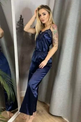 Satynowa piżama koszulka + długie spodnie CAROLINE, granat
