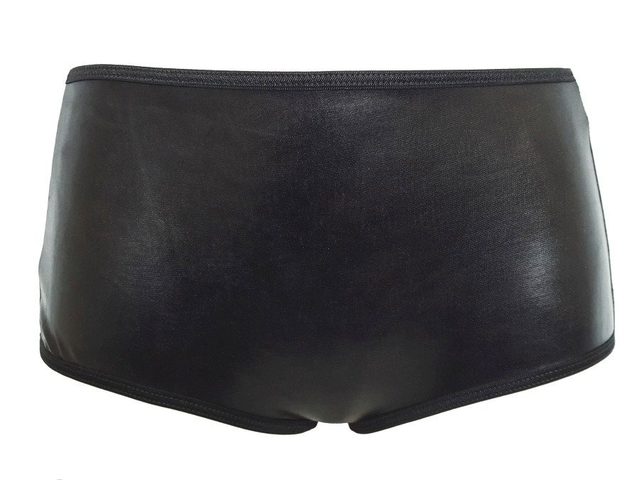 - Niezwykle kuszące majteczki wykonane z błyszczącego elastycznego materiału przypominającego latex. Tył z prowokującym dużym wycięciem odszytym satynową tasiemką ponętnie odsłaniającym pośladki.