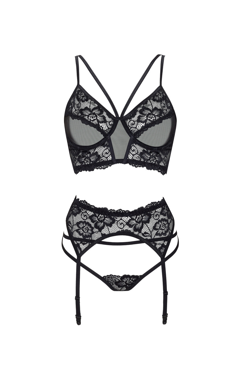 Pas uszyty z delikatnej koronki, posiada regulowane troczki do pończoch i zapięcie na haftki z tyłu. W komplecie są zmysłowe majteczki, które kusząco podkreślają bioderka
