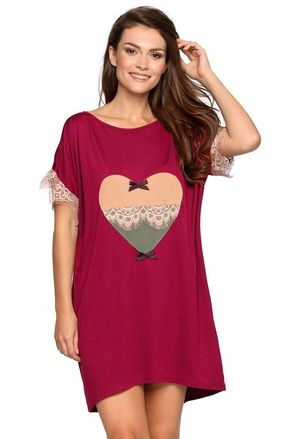 Elegancka i stylowa koszulka nocna o luźnym fasonie - w kolorze burgundowym. Model z krótkim rękawem z subtelnymi rozcięciami, rękawy wykończone koronką. Na przodzie koszulki naszyte jest dwukolorowe serce w połączeniu z koronką oraz zdobnymi kokardkami. Idealny pomysł na prezent.. Model wykonany z bardzo miękkiej i elastycznej dzianiny - wiskozy: 95% wiskoza, 5% polyamid. Do kompletu polecamy długą i krótką piżamę z serii P-577