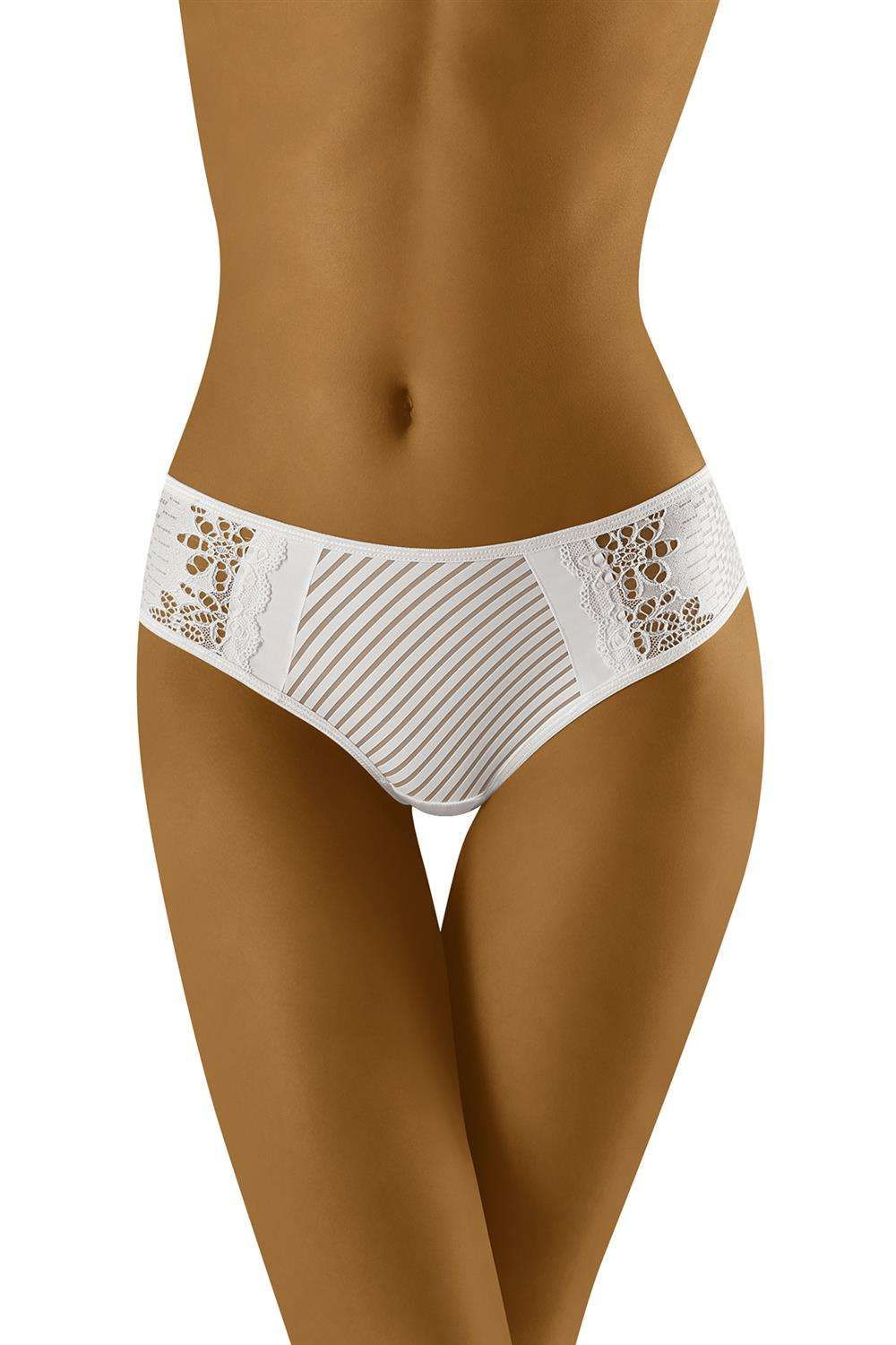 Delikatne stringi uszyte z dzianiny w elegancki prążek. U góry - śliczna, koronkowa lamówka. Skład: 83% poliamid, 17% elastan.