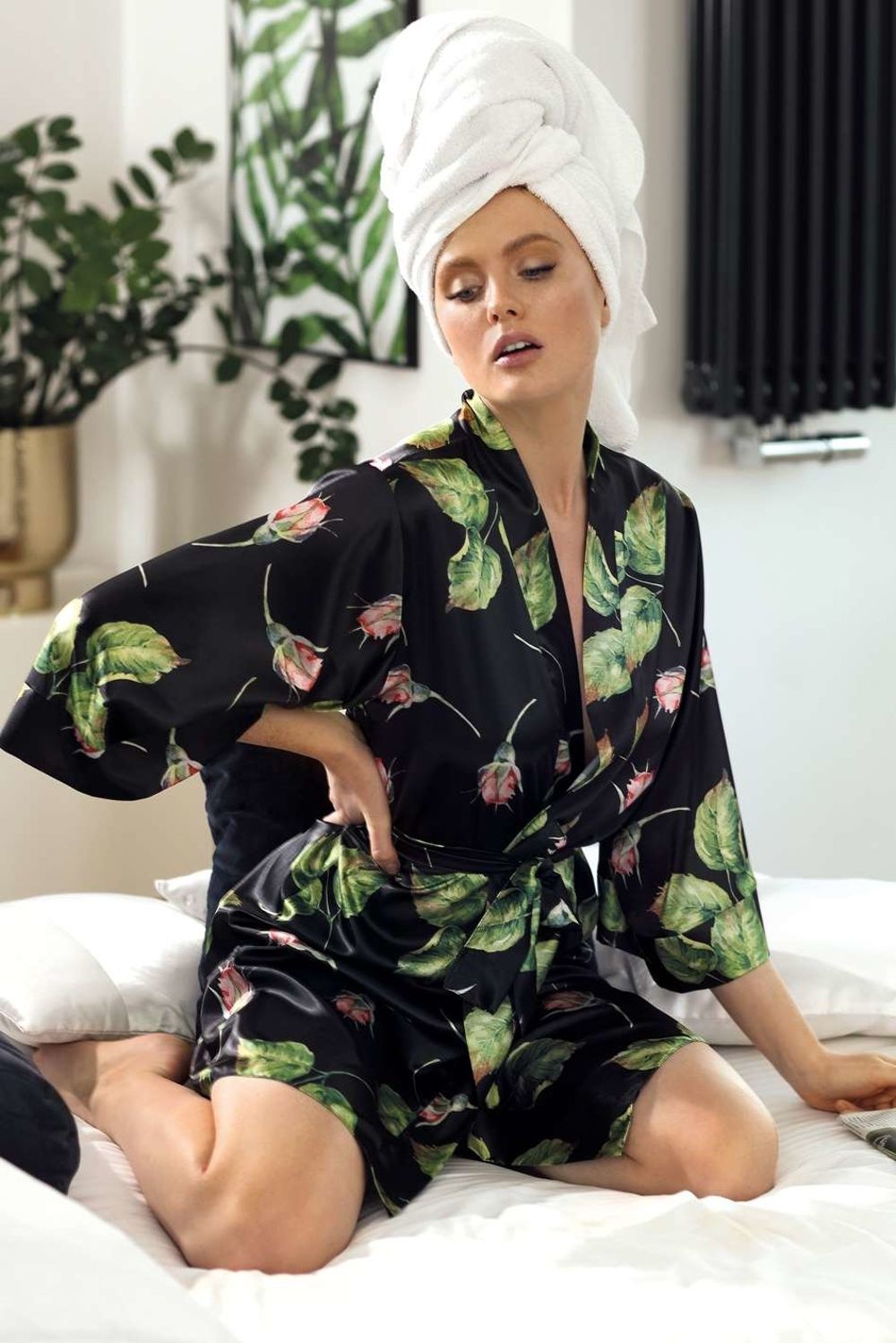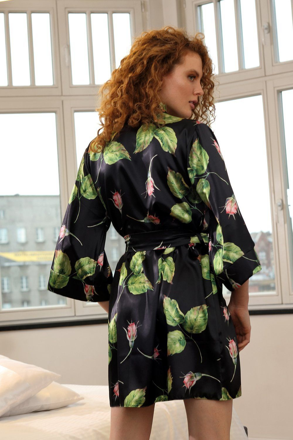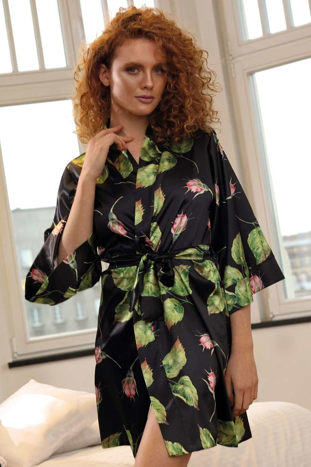 Satynowy szlafrok w kwiaty FLOWERS P008, czarno-zielony