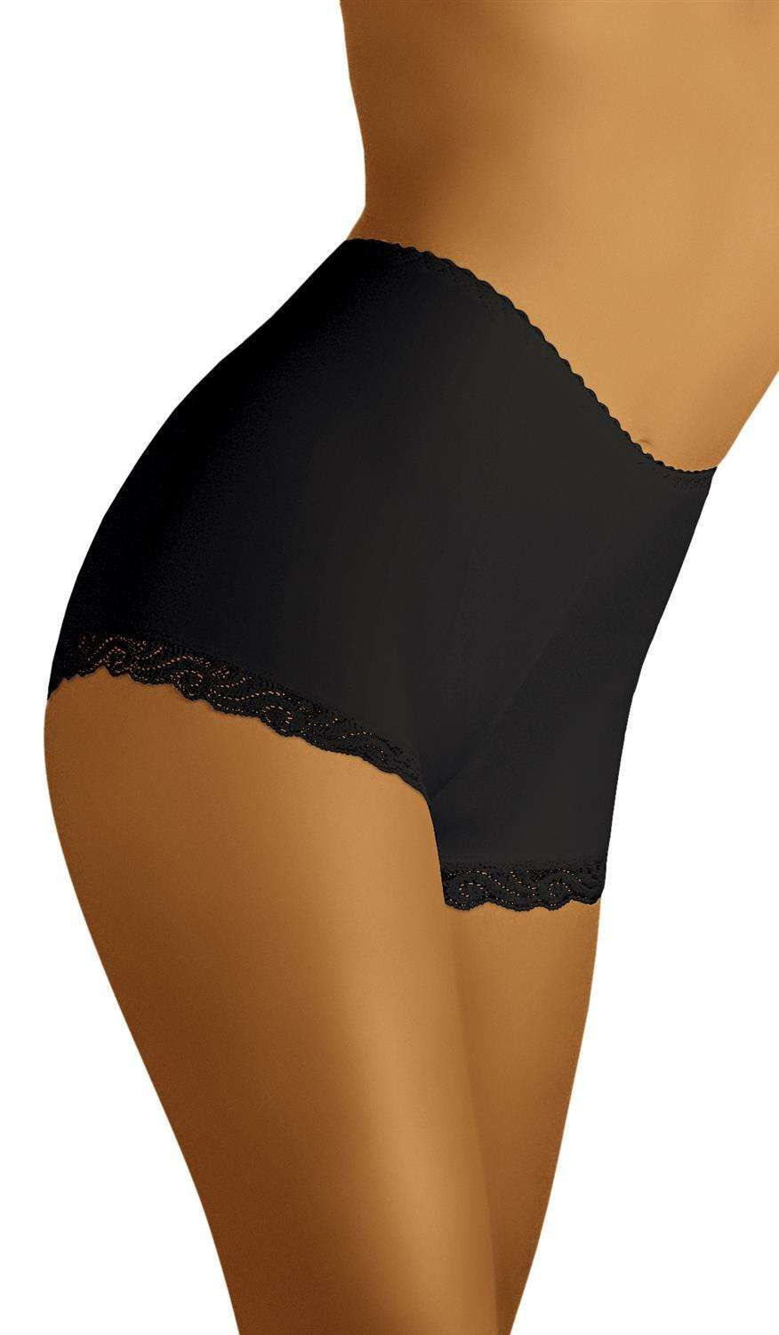 Wyższe szorty, delikatnie modelujące ciało wykonane z gładkiej, elastycznej dzianiny. Subtelnie zdobione delikatną koronką wokół ud. Gładki, czarny kolor. Skład: 83% poliamid, 17% elastan.