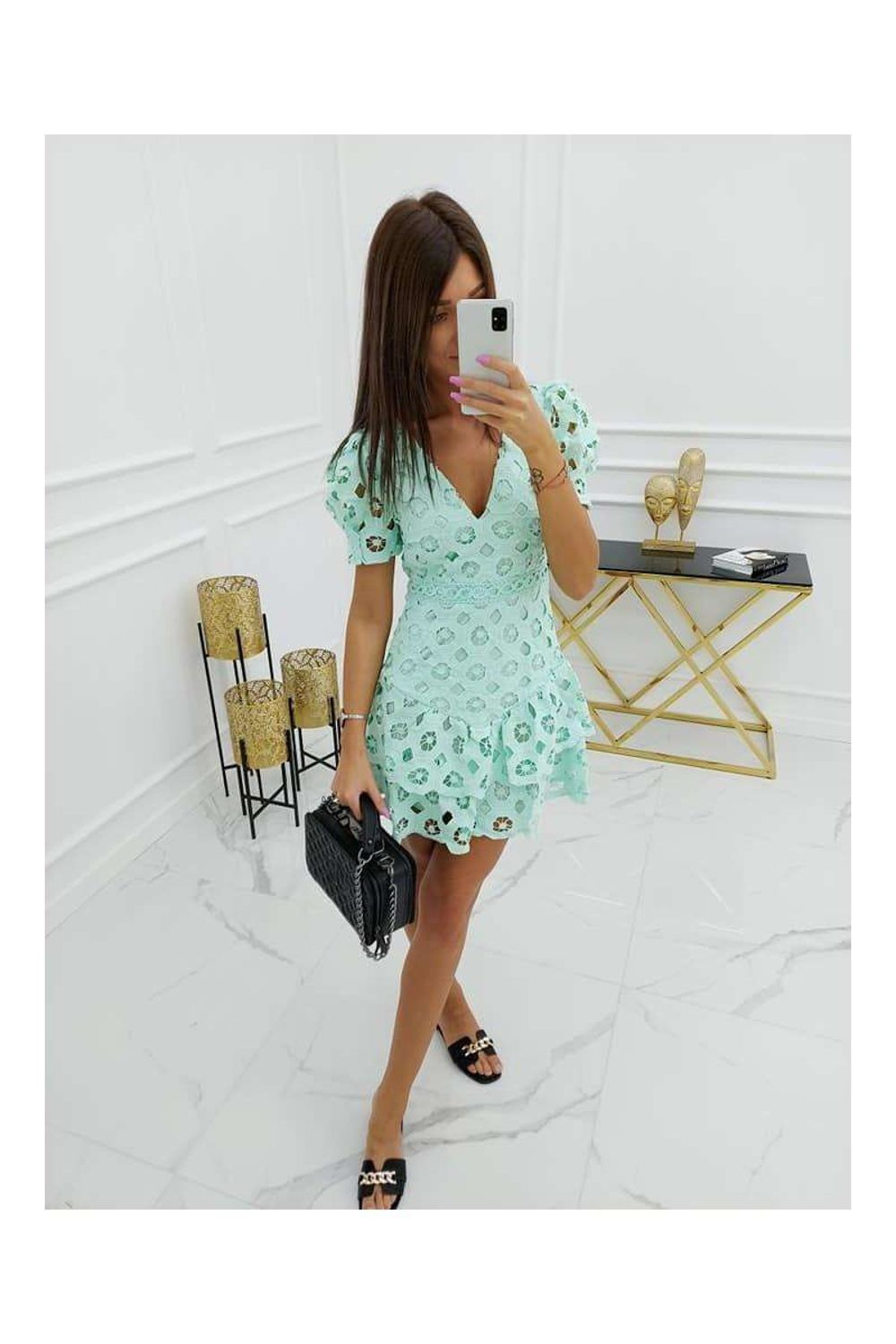 Efektowna sukienka, która pięknie prezentuje się na sylwetce. W zjawiskowym, wiosennym kolorze. Uszyta z miękkiej gipiury, zapinana na kryty suwak na plecach (suwak biegnie niemal przez całą długość sukienki - dzięki niemu sukienka bardzo zgrabnie podkreśla linię ciała). Dekolt typu V, dół luźny, z falbanami, wygodny. Rękawy w formie małych bufek. Idealna propozycja na wiosnę. Skład: 100% poliester.