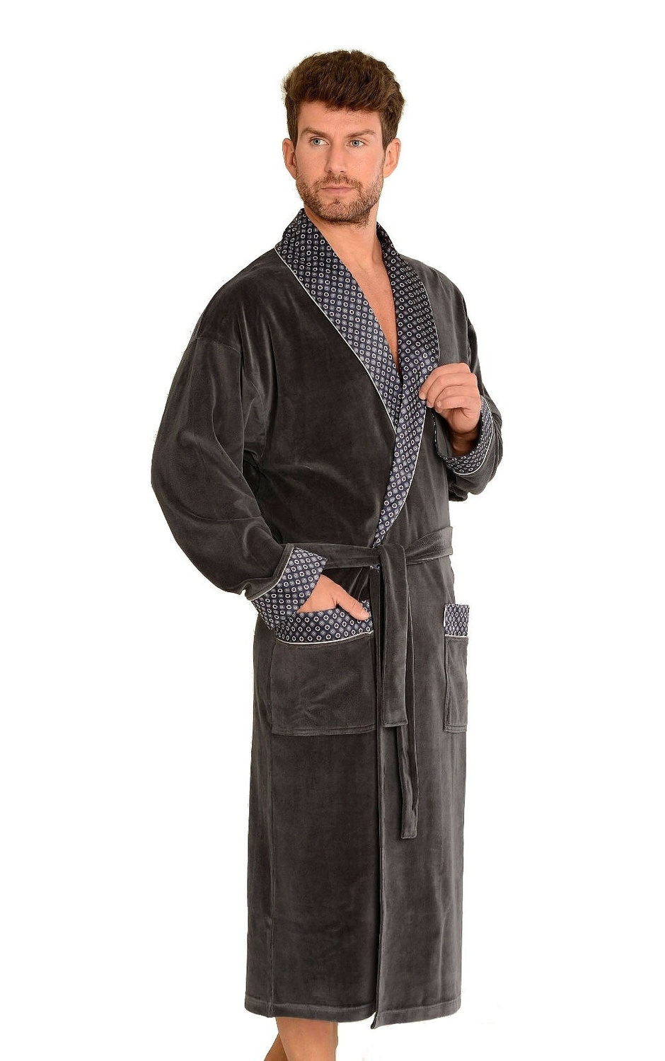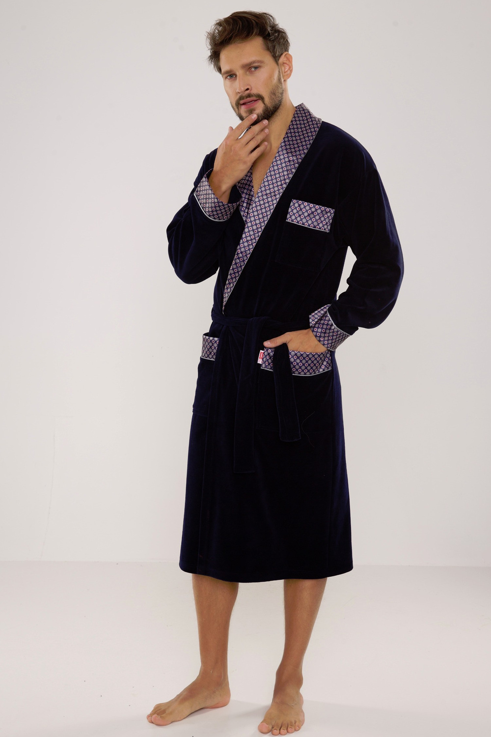 Długi welurowy szlafrok męski, z szalowym kołnierzem, wiązany na pasek, z dwoma naszytymi kieszeniami i jedną mniejszą na wysokości klatki piersiowej. Mankiety, kołnierz i kieszenie wykończone wzorzystą satyną.