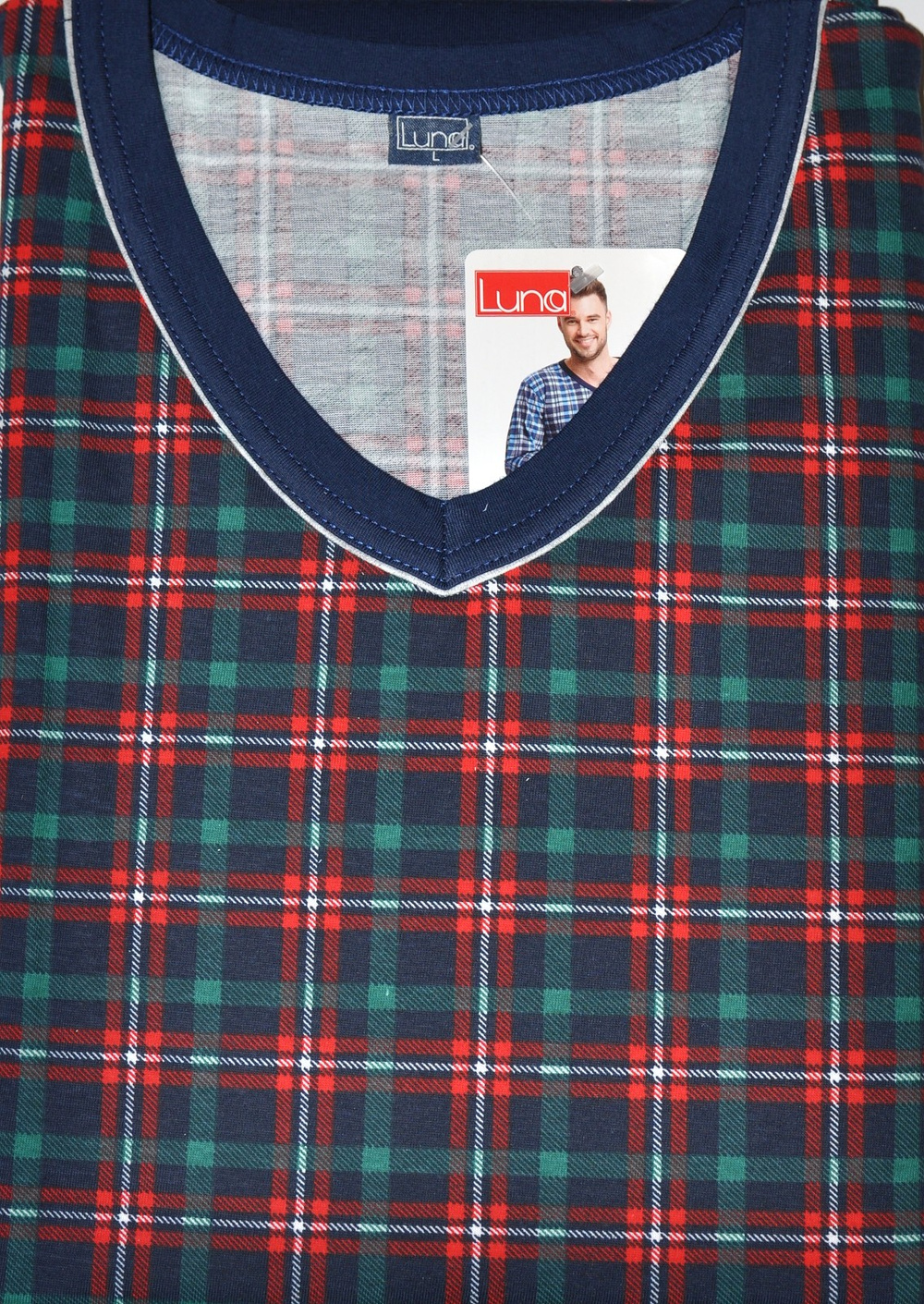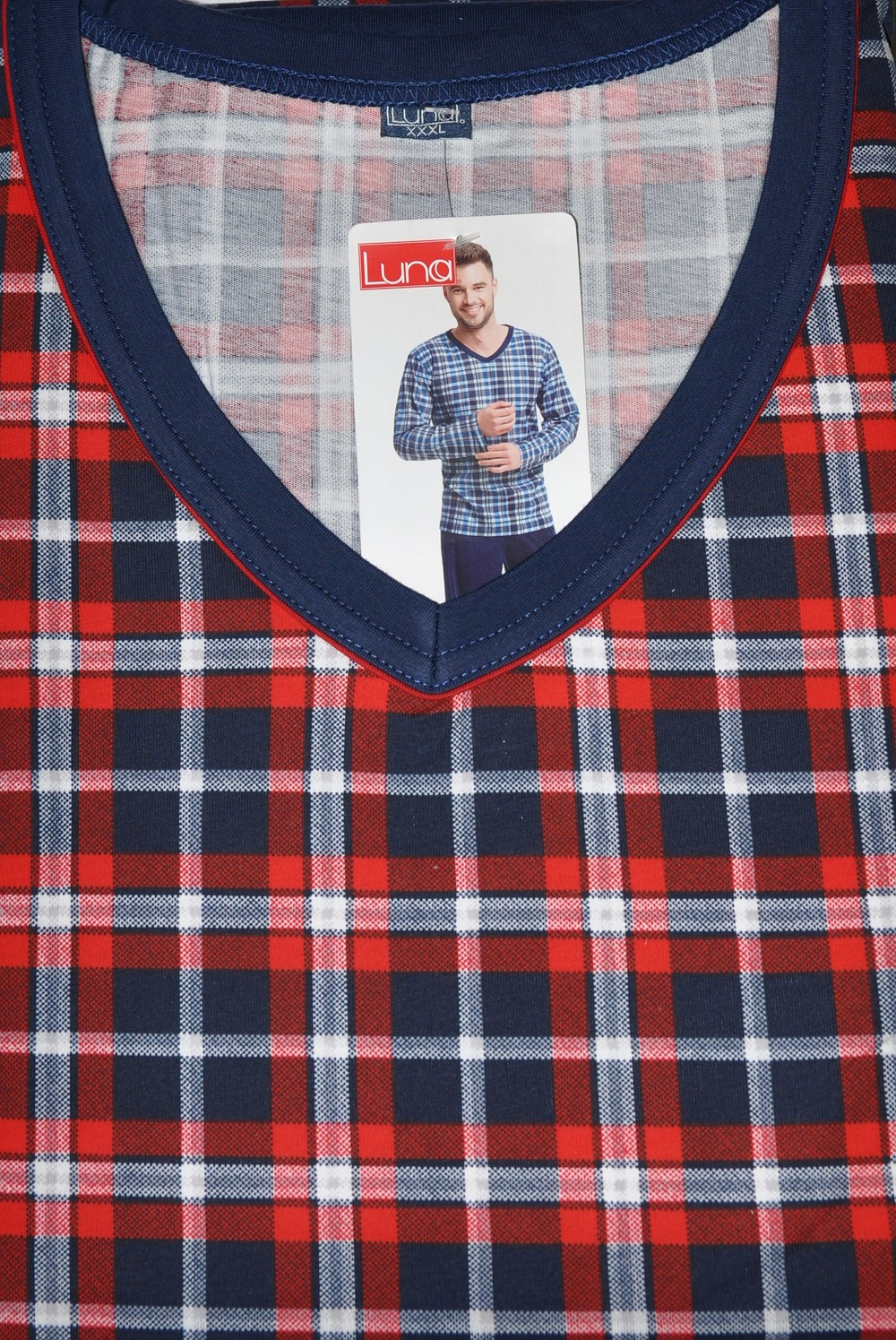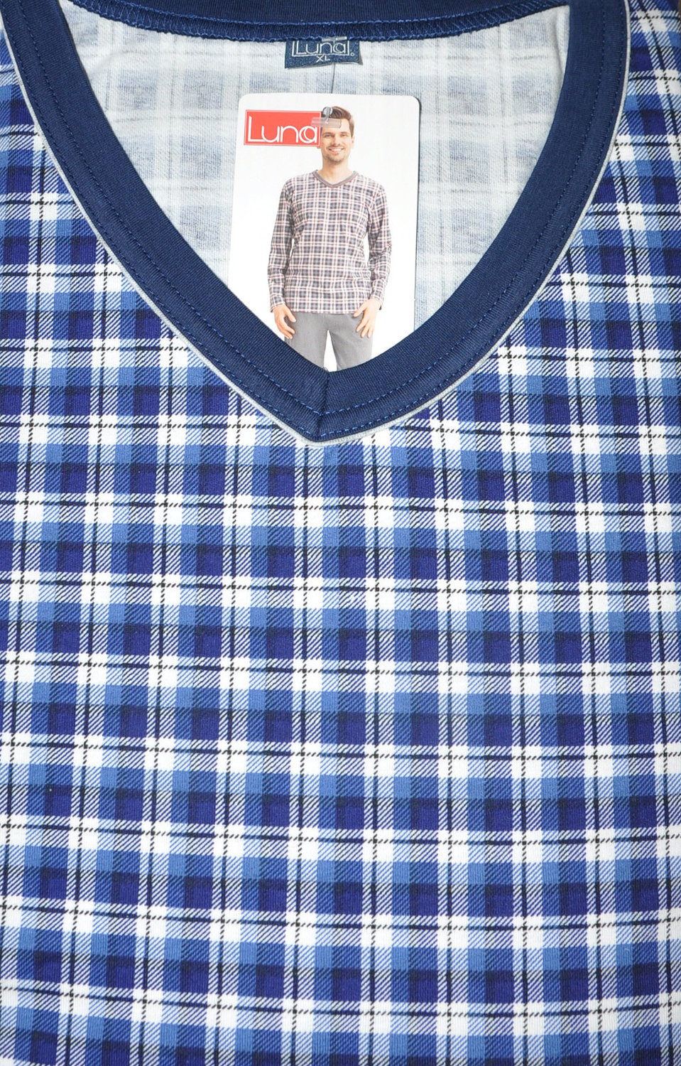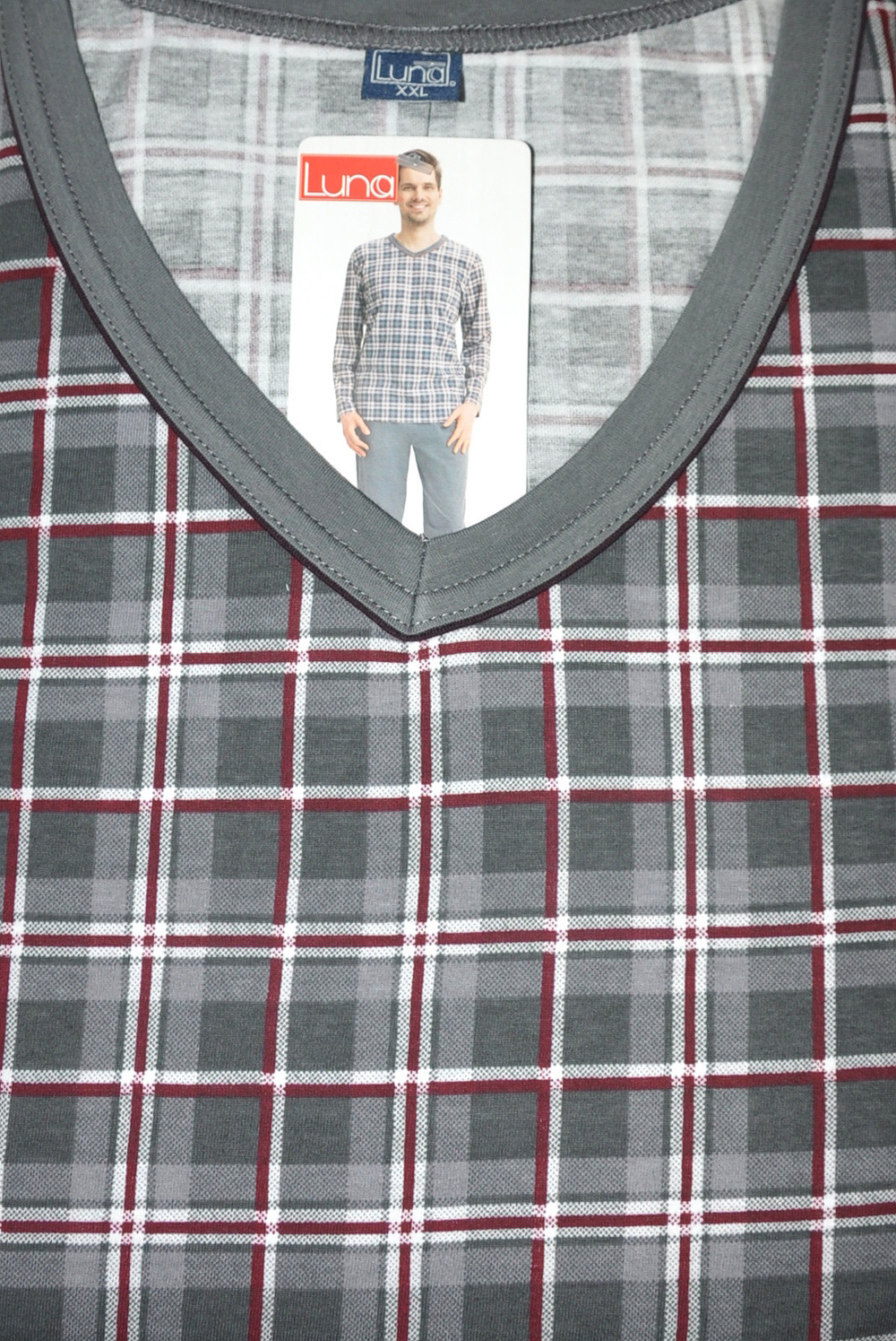 Piżama Luna 795 dł/r M-2XL męska grafitowy Piżama męska z wysokiej jakości bawełny. Wzorzysta bluza z długim rękawem, dekolt w serek. Spodnie długie, jednolite nawiązujące kolorystycznie do całości piżamy. Powyższe kolory występują w różnych wzorach.Skład: 100% bawełna Podmiot odpowiedzialny za ten produkt na terenie UE