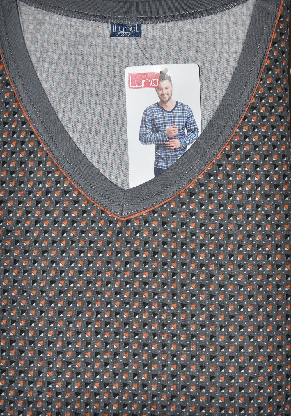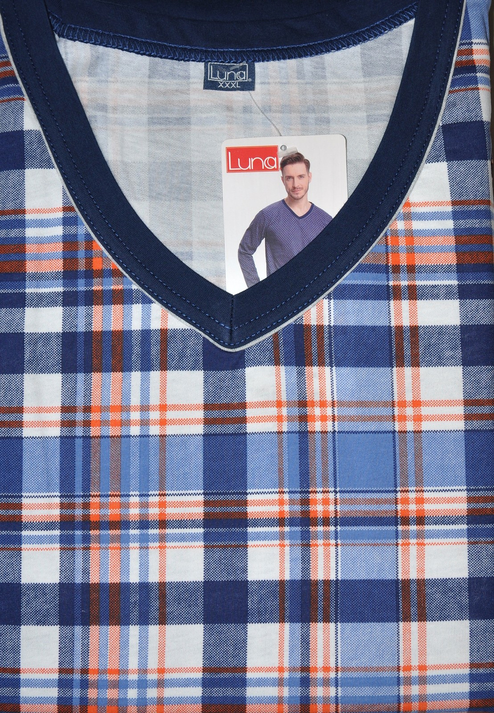 Piżama Luna 795 dł/r M-2XL męska granatowy Piżama męska z wysokiej jakości bawełny. Wzorzysta bluza z długim rękawem, dekolt w serek. Spodnie długie, jednolite nawiązujące kolorystycznie do całości piżamy. Powyższe kolory występują w różnych wzorach.Skład: 100% bawełna Podmiot odpowiedzialny za ten produkt na terenie UE