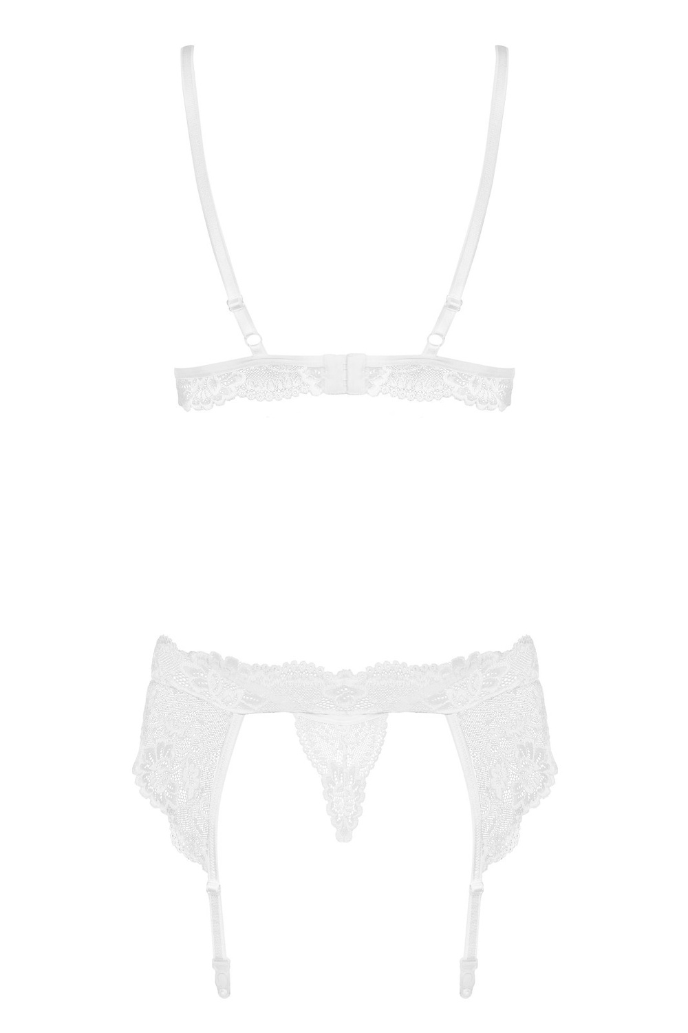 Uwodzicielski komplet z koronki o kwiatowym motywie. Biustonosz na wąskich ramiączkach z regulacją, miseczki podszyte tkaniną, delikatnie usztywnione. Zapięcie trzystopniowe na podwójną haftkę. W komplecie stringi i pas do pończoch z troczkami z regulacją długości. Idealny komplet z pończochami Obsessive 810 . Skład: 90% poliamid, 10% elastan.