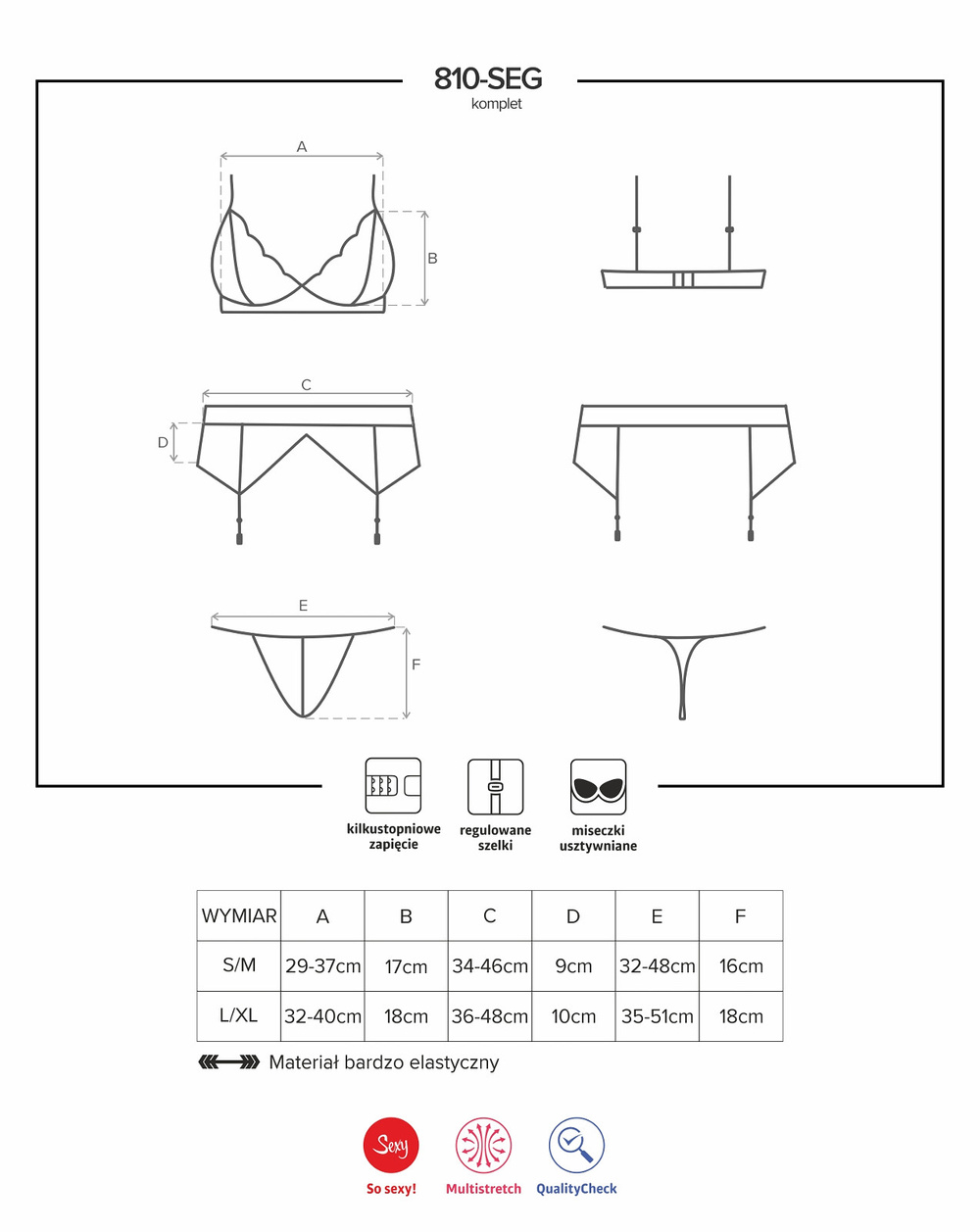 Uwodzicielski komplet z koronki o kwiatowym motywie. Biustonosz na wąskich ramiączkach z regulacją, miseczki podszyte tkaniną, delikatnie usztywnione. Zapięcie trzystopniowe na podwójną haftkę. W komplecie stringi i pas do pończoch z troczkami z regulacją długości. Idealny komplet z pończochami Obsessive 810 . Skład: 90% poliamid, 10% elastan.