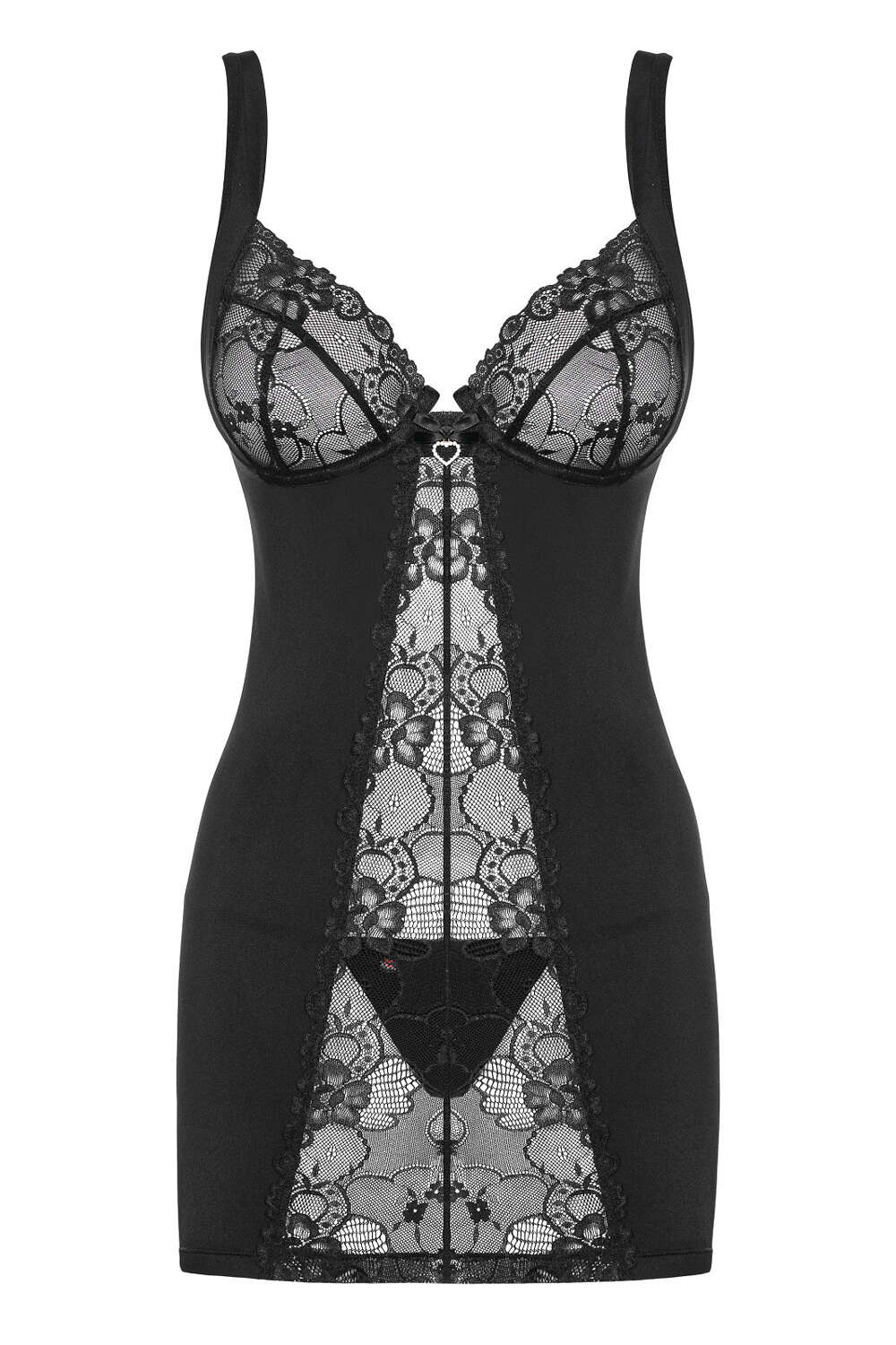 Romantyczna koszulka w kolorze czarnym, z gładkiej mikrofibry w połączeniu z koronką o kwiatowym motywie. Miseczki miękkie, z fiszbinami, na ich łączeniu satynowa kokardka i połyskujące serduszko z cyrkonii. Ramiączka z regulacją. Efektowny tył. W komplecie stringi. Skład: 85% poliamid, 15% elastan