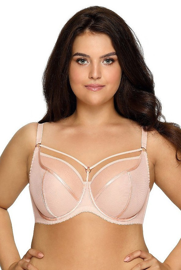 Biustonosz miękki z fiszbinami, wykonany z podwójnej warstwy siateczki z połyskującymi przeszyciami. Górna część miski z delikatnej siateczki. Nad miseczkami ozdobne, elastyczne paseczki połączone metalowym, tęczowymi kółeczkami. Ramiączka z regulacją nieodpinane. Konstrukcja K-1391. Skład: 88% poliamid, 8% bawełna, 4% elastan