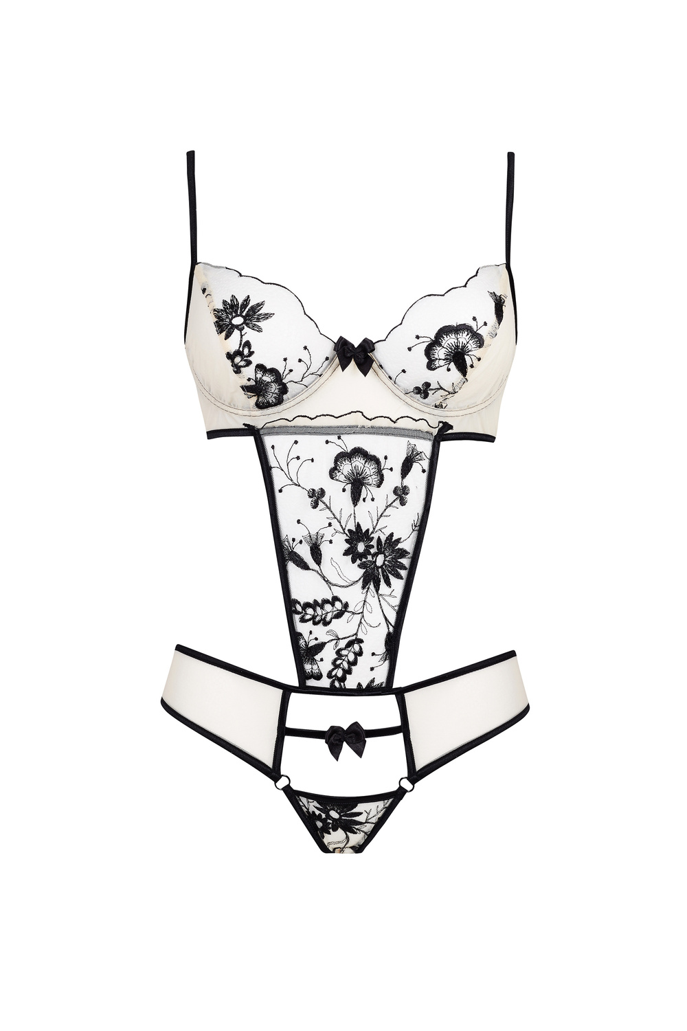 - Misternie wykonane, ekskluzywne body z oryginalnym kwiatowym haftem w formie tatuażu na cielistym tiulu.