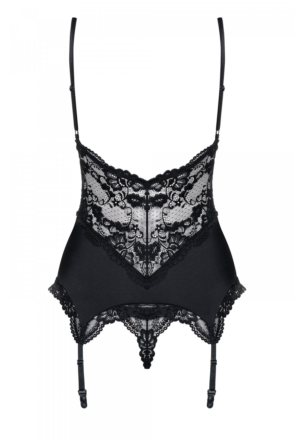 Uwodzicielski gorset z koronki o kwiatowym motywie i gładkiego, przyjemnego w dotyku materiału. Miseczki lekko usztywnione, ramiączka wąskie z regulacją. U dołu troczki do przypięcia pończoch - z regulacją. W komplecie stringi. Idealny komplet z pończochami Obsessive 810. Skład: 85% poliamid, 15% elastan.