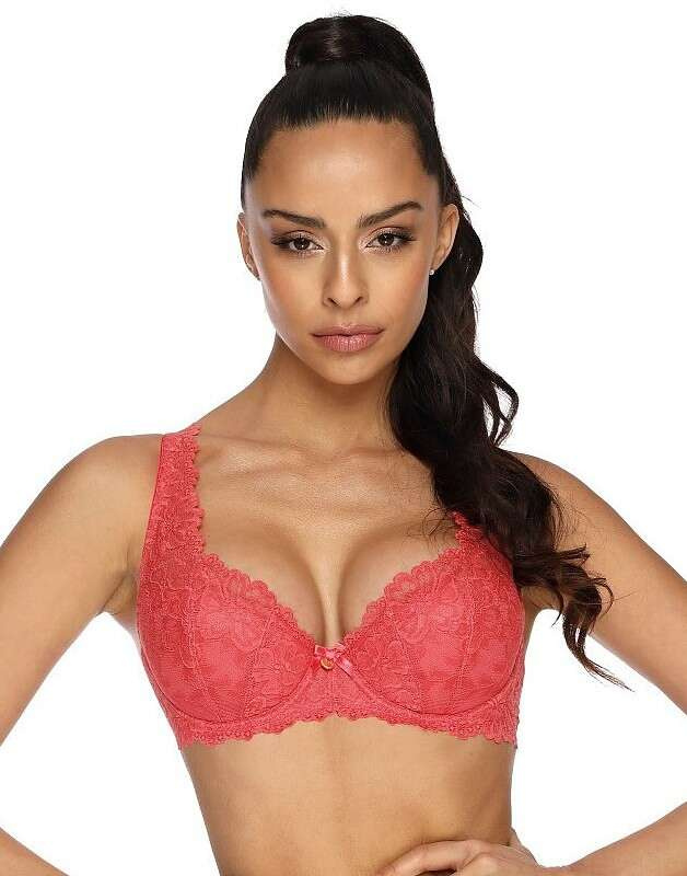 Biustonosz full cup- miseczki z koronki, podszyte bawełną - boczki koronkowe- ozdobne ramiączka, nieodpinane Skład: 44% poliamid, 17% bawełna, 17% poliester, 17% poliuretan, 5% elastan