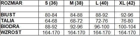 Rozmiar | Szerokość w biuście (cm) | Szerokość w pasie (cm) | Szerokość w biodrach (cm) | Wzrost |