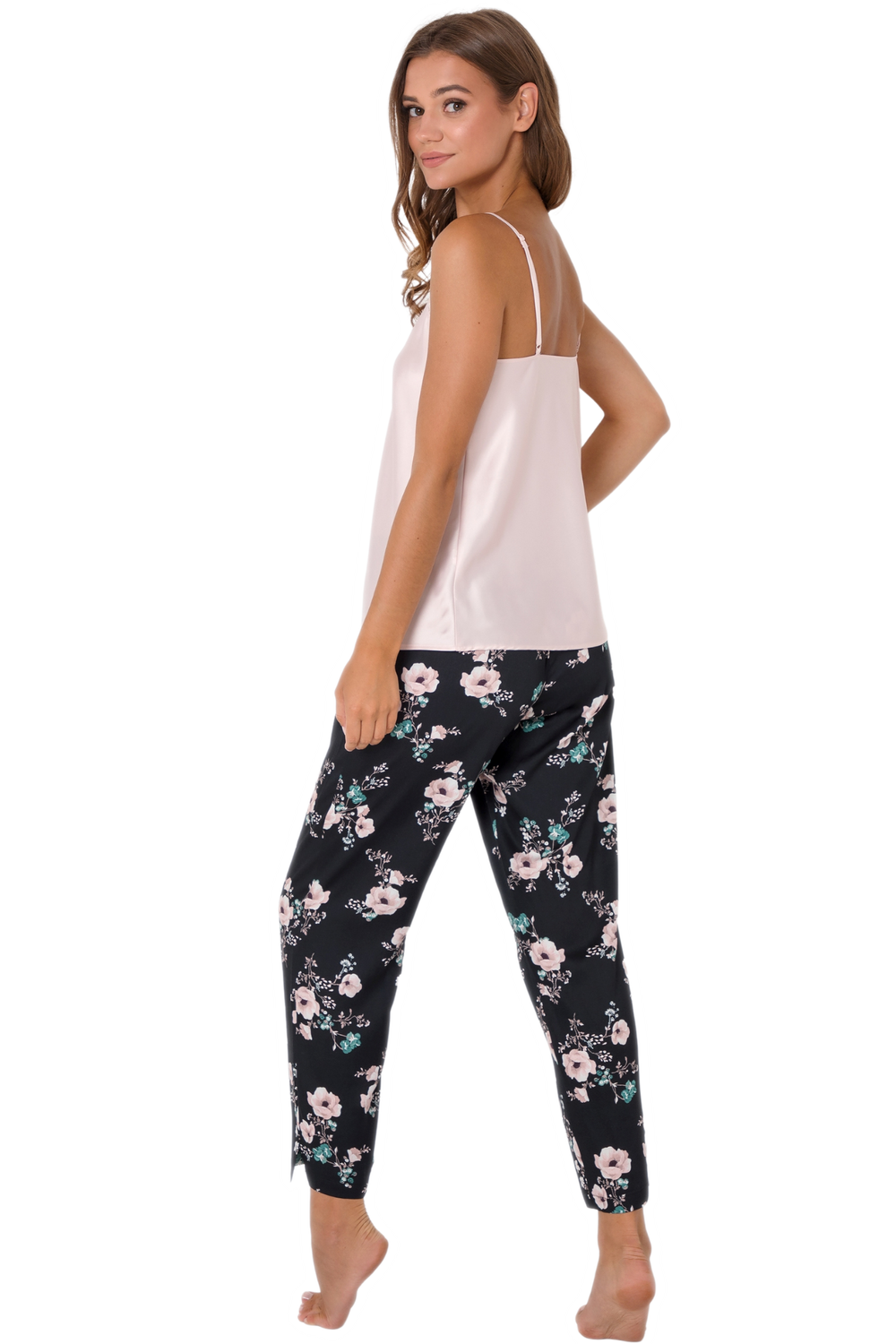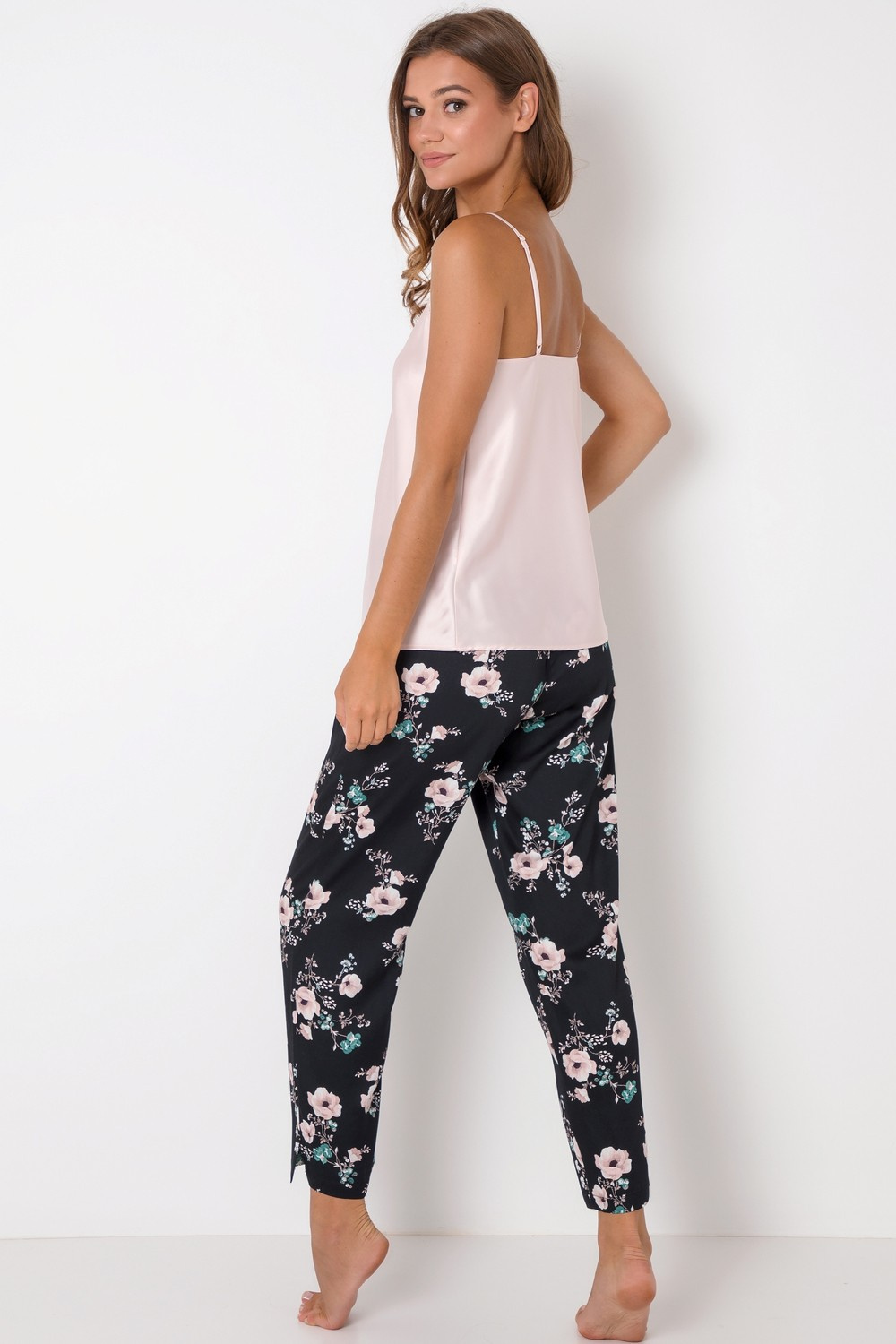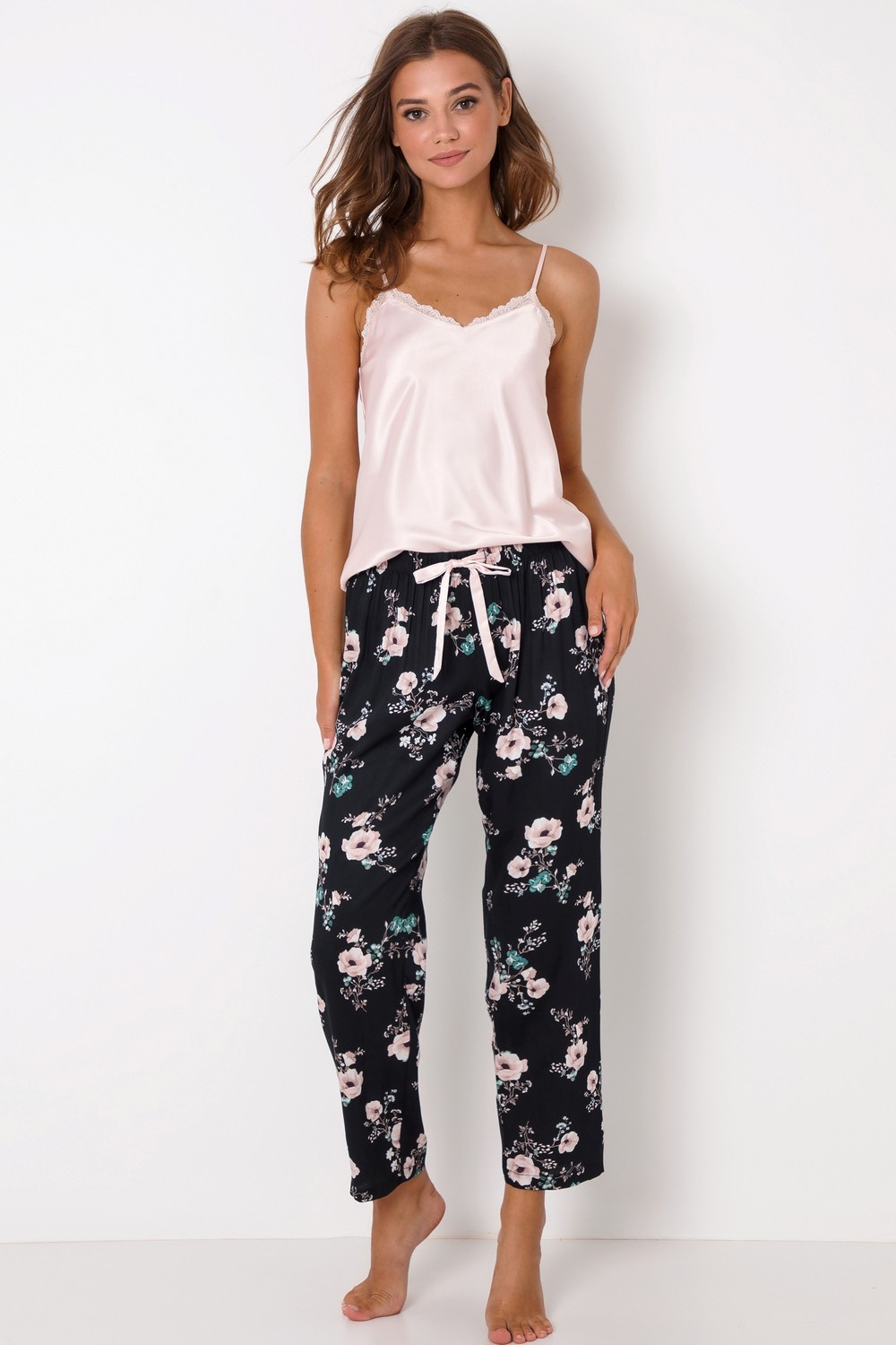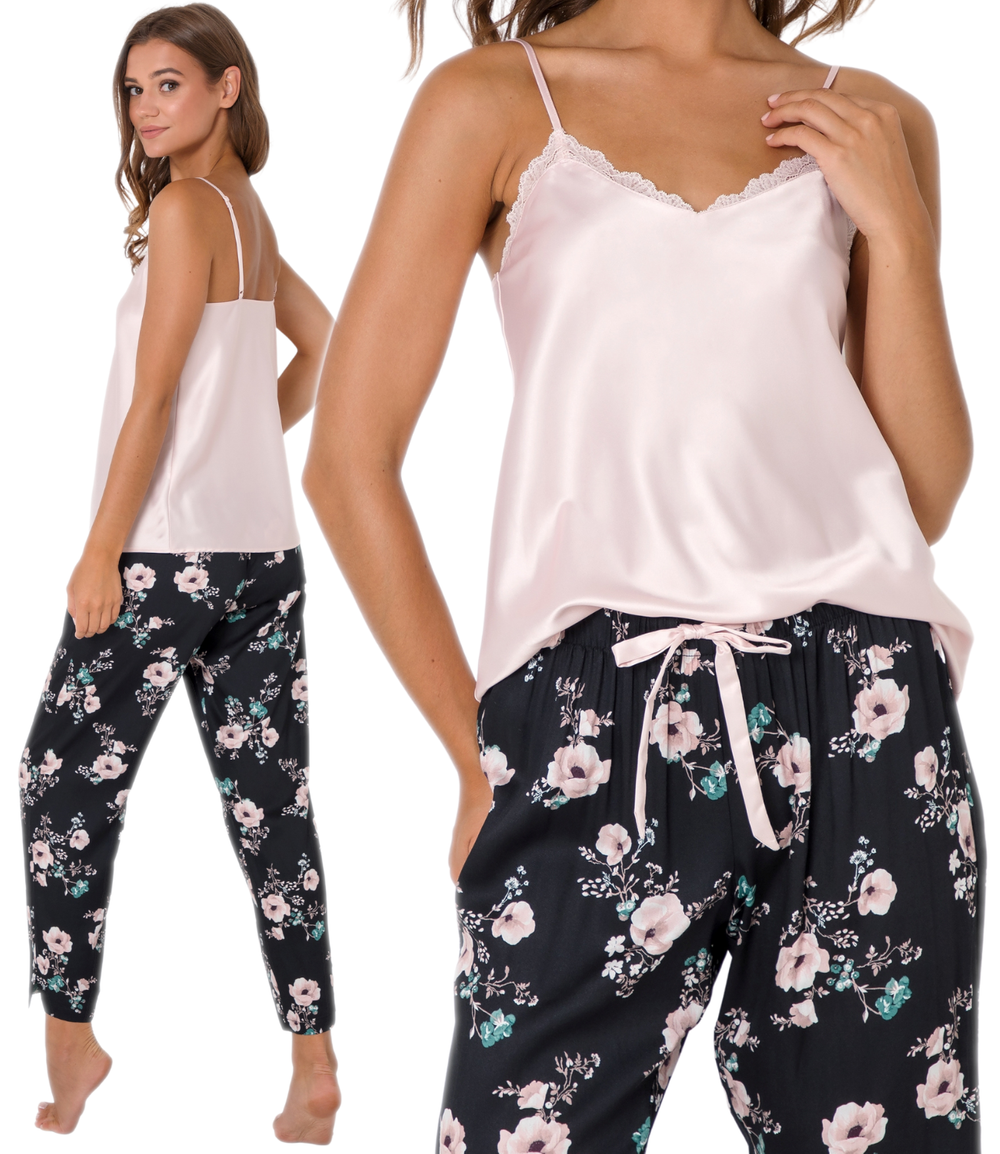 Modna i wygodna piżama damska z przyjemnej w dotyku wiskozy. Góra z lekko połyskującej tkaniny to gładka, krótka koszulka na regulowane ramiączka w kolorze jasnego różu. Dekolt w serek, wykończony koronką. Do kompletu długie, czarne spodnie z kwiatowym motywem. Nogawki proste. W pasie wygodna gumka oraz kokardka. Piżamka idealna na każdą porę roku.