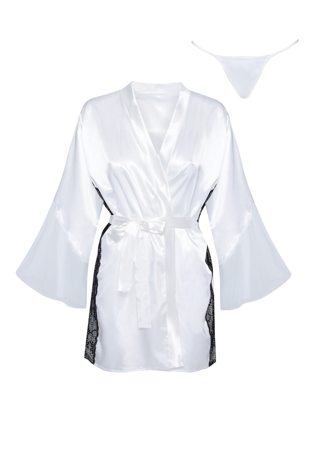 Szlafrok posiada koronkowe wstawki oraz wiązanie w pasie pięknie podkreśląjące talię