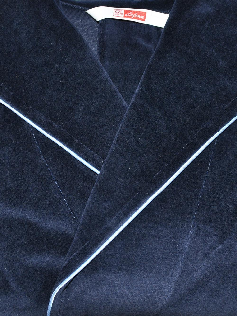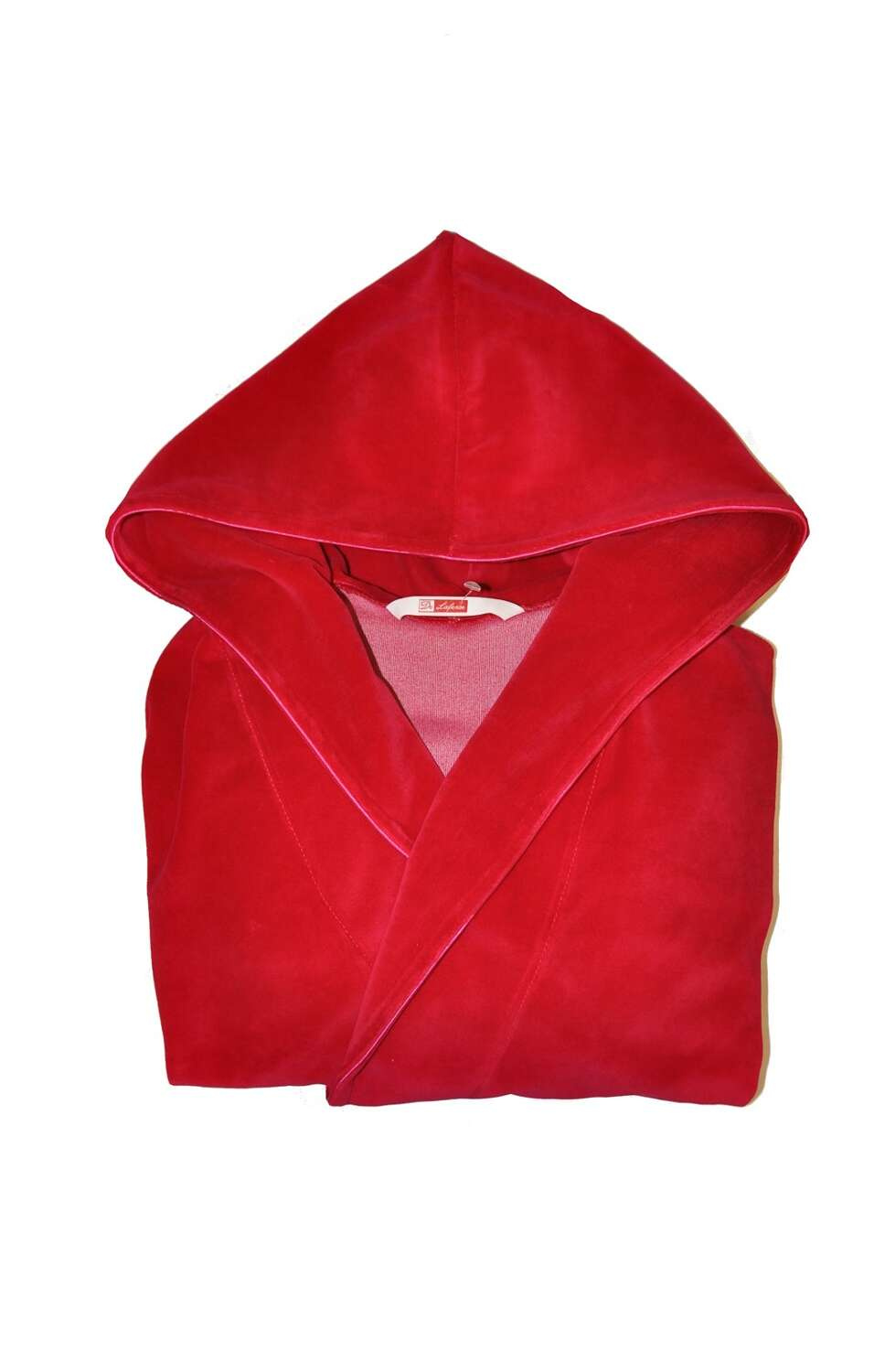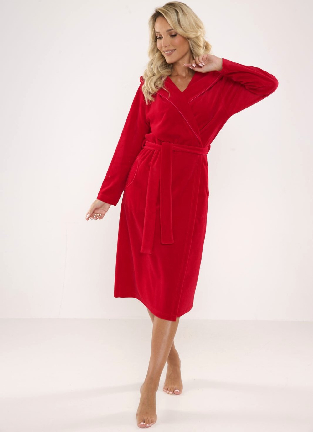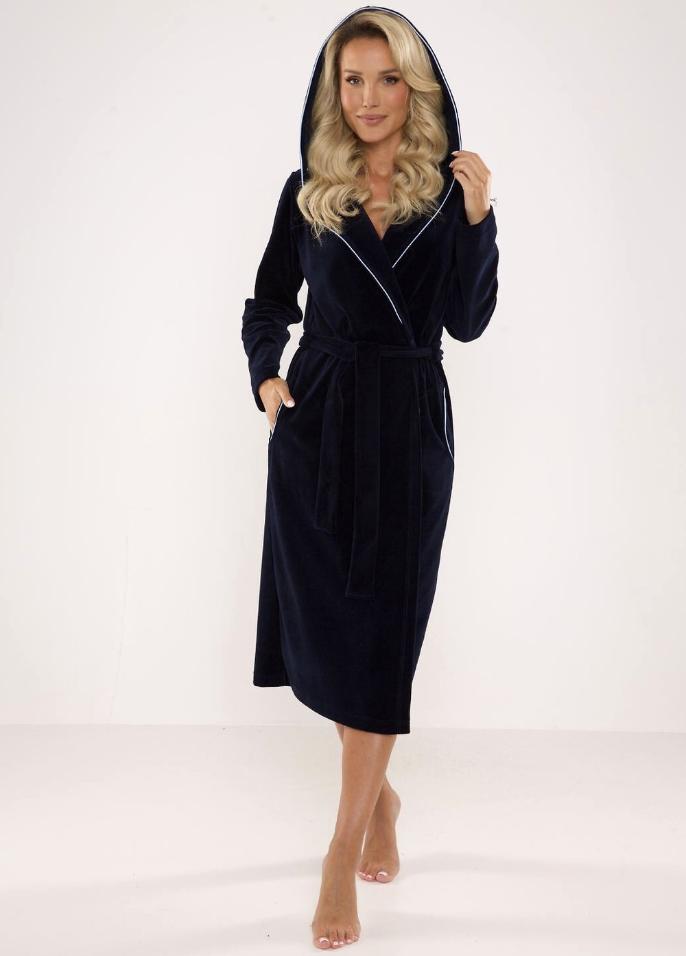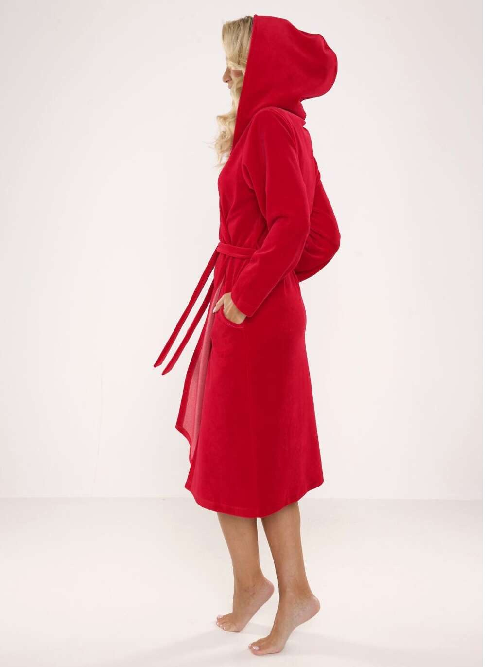 Długi, wygodny szlafrok damski z kapturem- wykonany z miłego i przyjemnego dla ciała weluru- wiązany w pasie, z kieszeniami- obszyty lamówką z satyny Na zdjęciu brak kaptura Skład: 80% bawełna, 20% poliamid