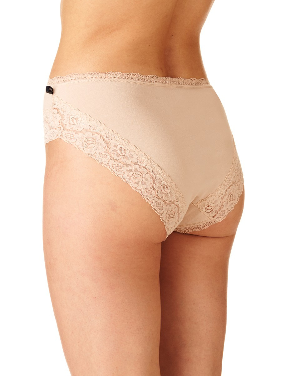 Klasyczne figi damskie- krój typu midi bikini- wyższa linia talii, z szerszymi bokami- wykonane z wysokiej jakości bawełny- przód i tył zdobią koronkowe wykończenia- koronkowy pas - pakowane w pudełko po dwie sztukiSkład: 95% bawełna, 5% elastan; koronka 90% poliamid, 10% elastan