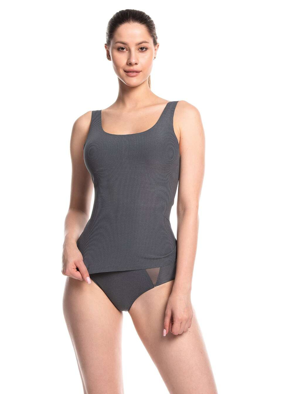 Koszulka damska w drobny prążek- szerokie ramiączka- od wewnętrznej strony miseczki wyprofilowane miękką gąbeczką- wykonana w technologii bezszwowej, cięta laserowo - ultracienkie wykończenie brzegów - doskonale dopasowuje się do ciała Skład: 55% poliamid, 28% poliester, 17%