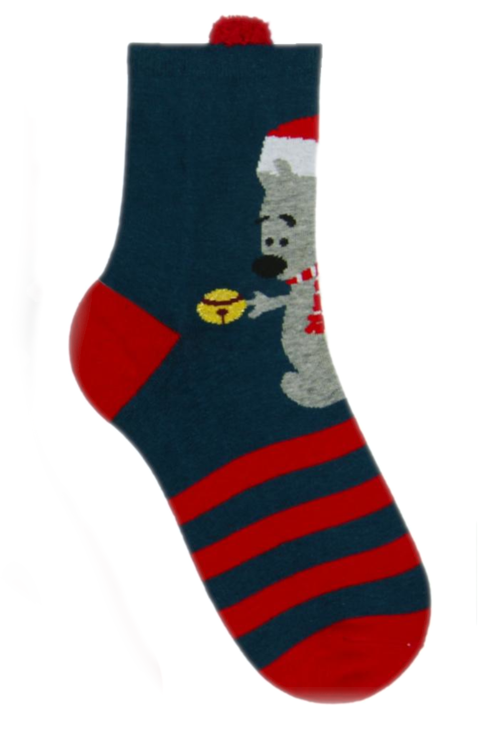 Urocze skarpetki z motywem świątecznym oraz czerwonymi paskami. Miła i przyjemna w dotyku tkanina.