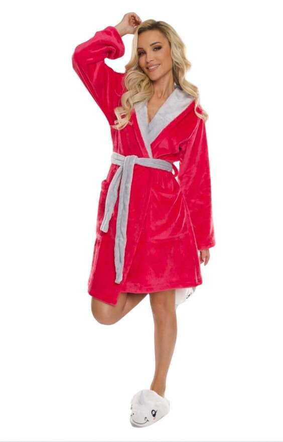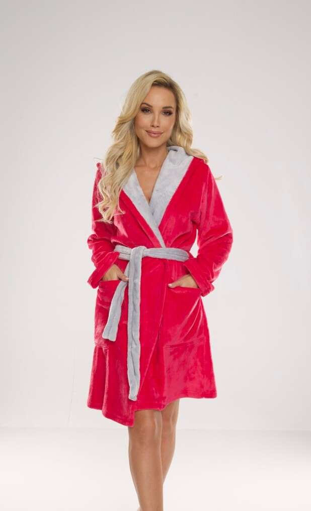 Krótki szlafrok damski z kapturem- miękki i przyjemny w dotyku materiał- długi rękaw- wiązany w pasie- dwie zewnętrzne kieszenie - długość do kolan- dekolt i kaptur w kontrastującym kolorzeSkład: 100% poliester