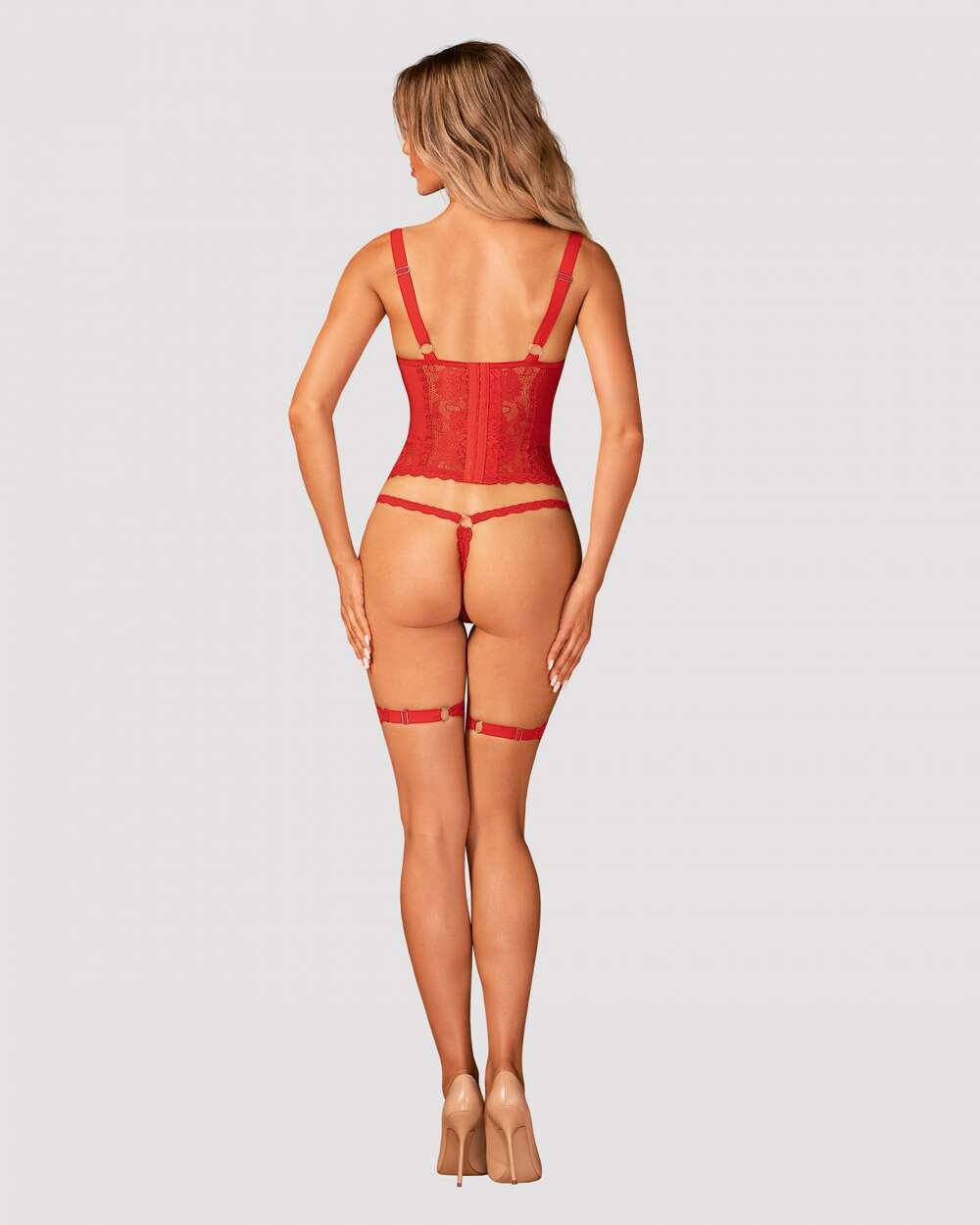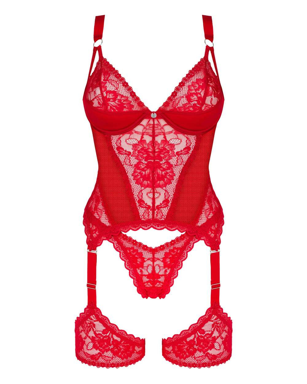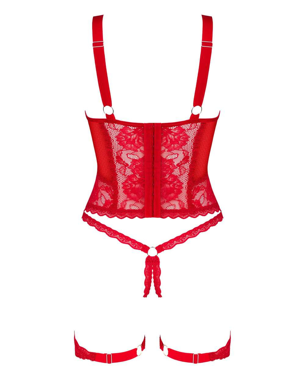 Gorset Belovya w czerwieni- ponadczasowa koronka- delikatna siateczka- miseczki z fiszbinami, piękna ekspozycja biust- szerokie, regulowane ramiączka biustonosza zdobione biżuteryjnymi kółeczkami- zapięcie na haftki na plecach- odpinane podwiązki z regulowanymi paseczkamiSkład: 90% poliamid, 10% elastanPodmiot odpowiedzialny za ten produkt na terenie UE