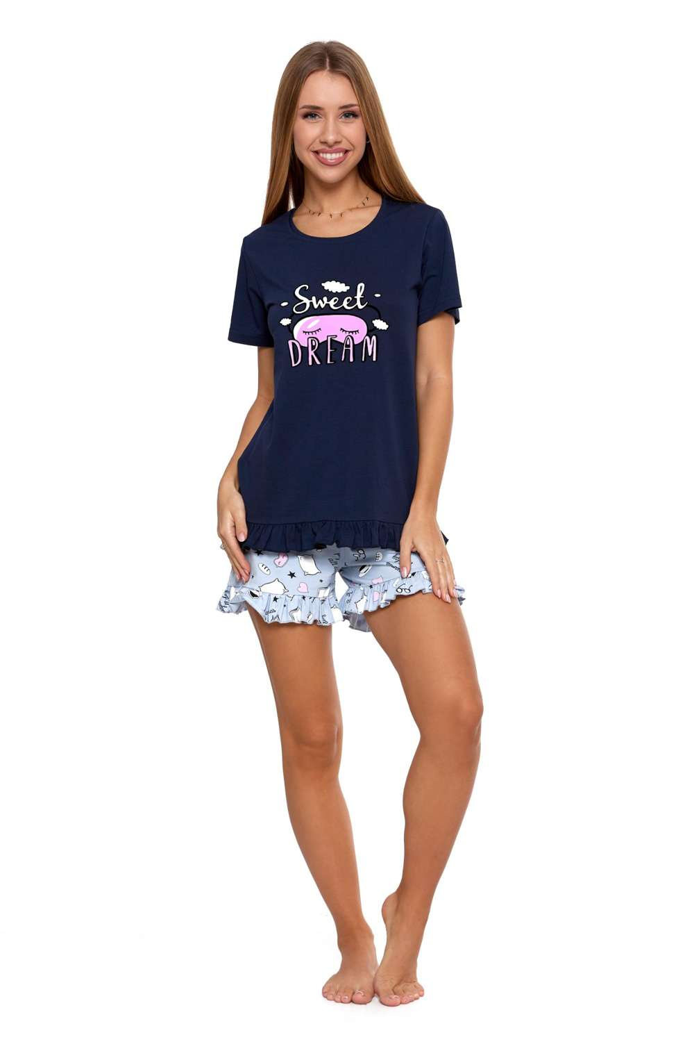 Damska bawełniana piżamka wyprodukowana w Polsce. Góra to bluzka na krótki rękaw z okrągłym dekoltem. Na bluzce modny nadruk z chmurką oraz napisem " Sweet Dream ". Do kompletu krótkie spodenki w niebieskim kolorze z takim samym motywem. Dół wykończony elegancką koronką. W pasie wygodna gumka. Ten model posiada ponadczasowy krój, który posłuży Ci na wiele lat. Piżama jest idealna do noszenia w domu i zapewnia relaks i odpoczynek po ciężkim dniu.