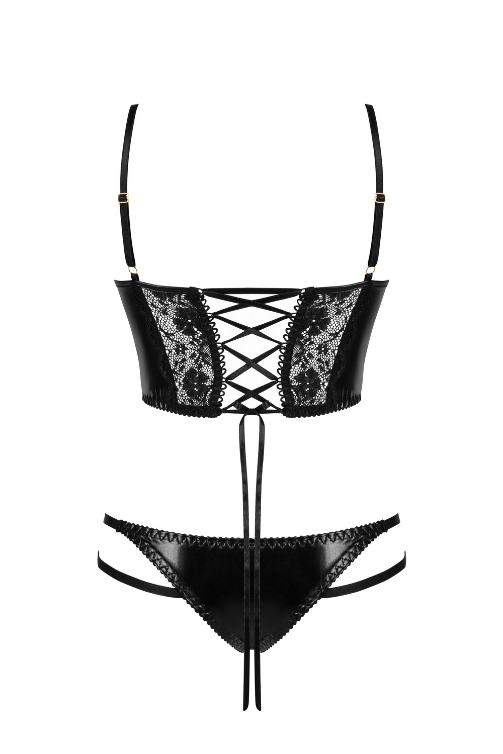 Finezyjny komplet wykonany z koronki oraz błyszczącego materiału a la latex. Krótki top z fiszbinami połączony za pomocą zapięcia ze stringami przypomina nieco body. Top posiada fiszbiny oraz efektowne sznurowanie z tyłu, a także regulowane ramiączka. Zarówno top, jak i stringi wykończone uroczymi, małymi kokardkami.