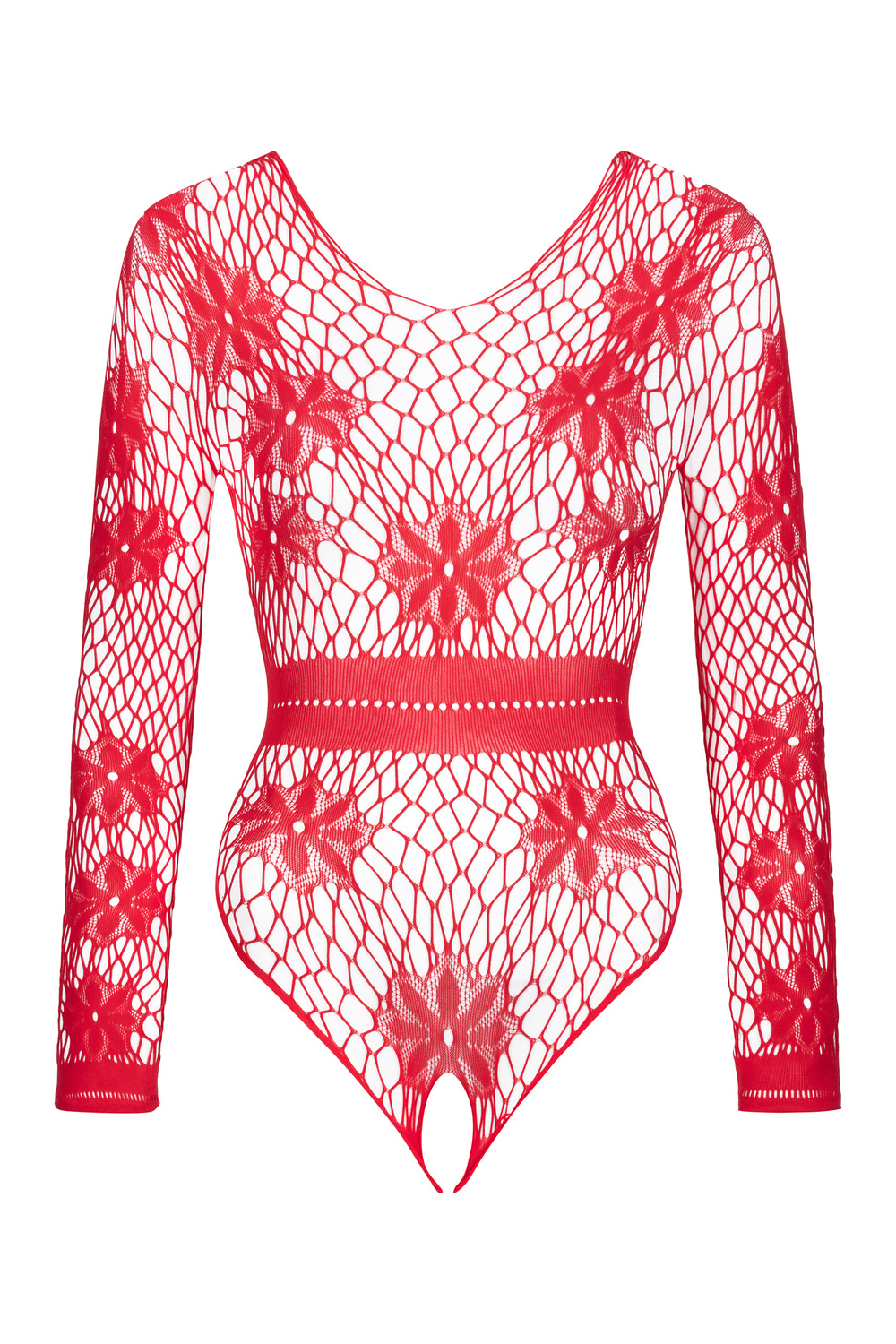 Czerwone seksowne body dla miłośniczek wygodnej, a zarazem prowokacyjnej bielizny. Wzór kabaretki z dużymi oczkami uzupełniają porozrzucane kwiaty oraz pasek w talii.