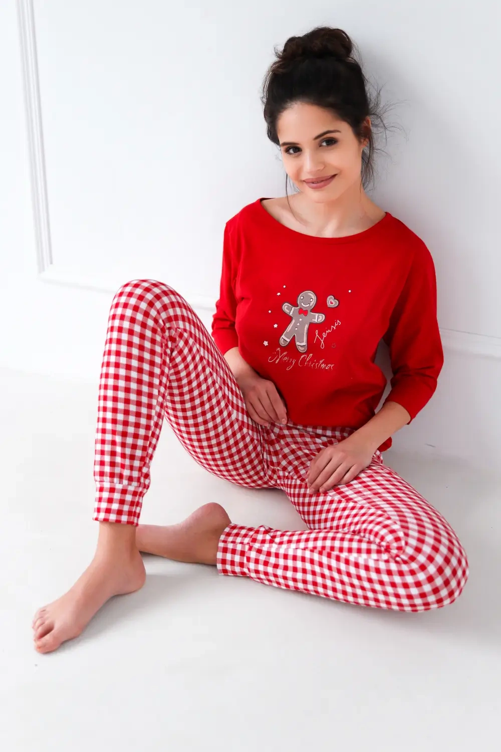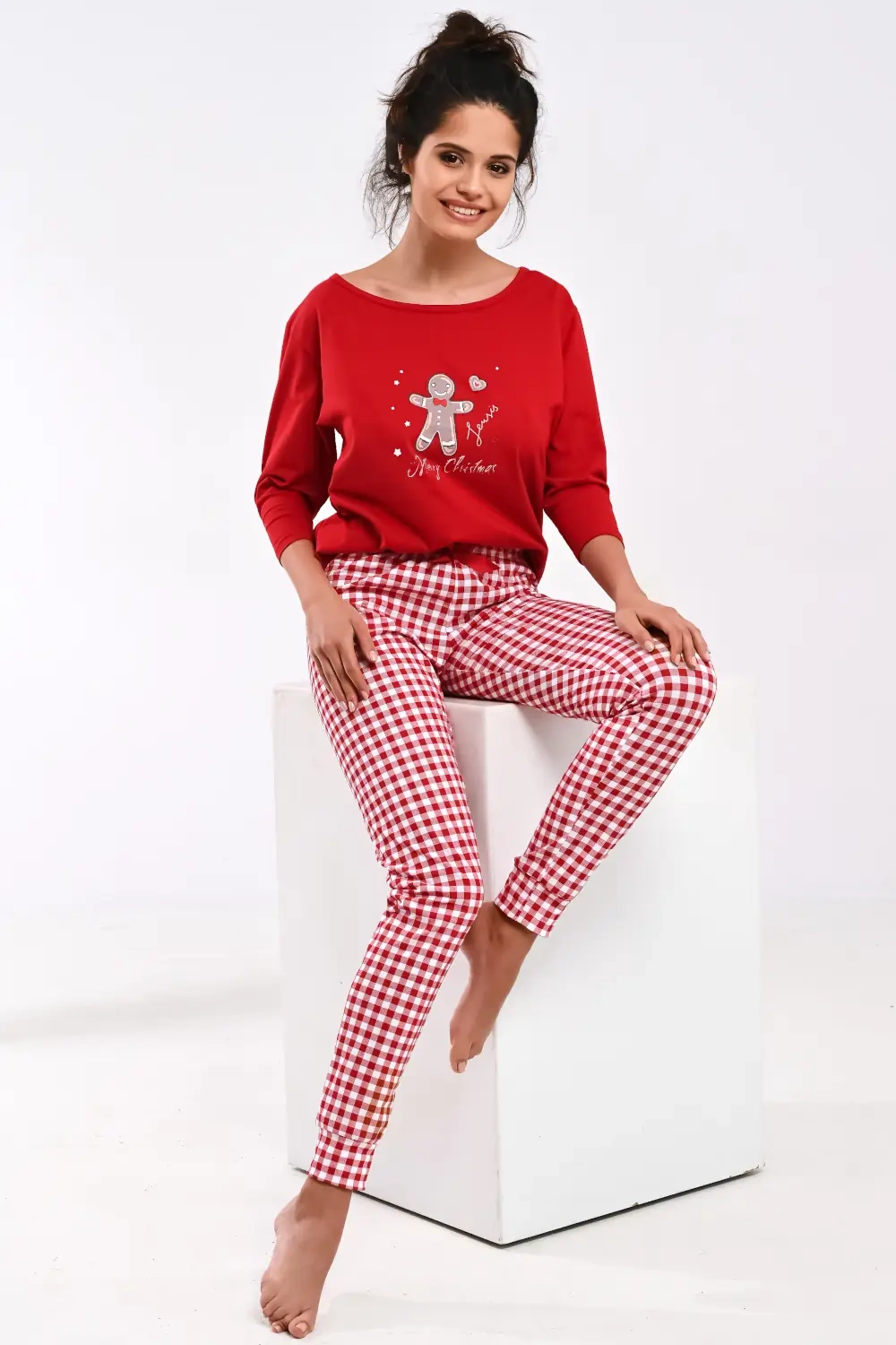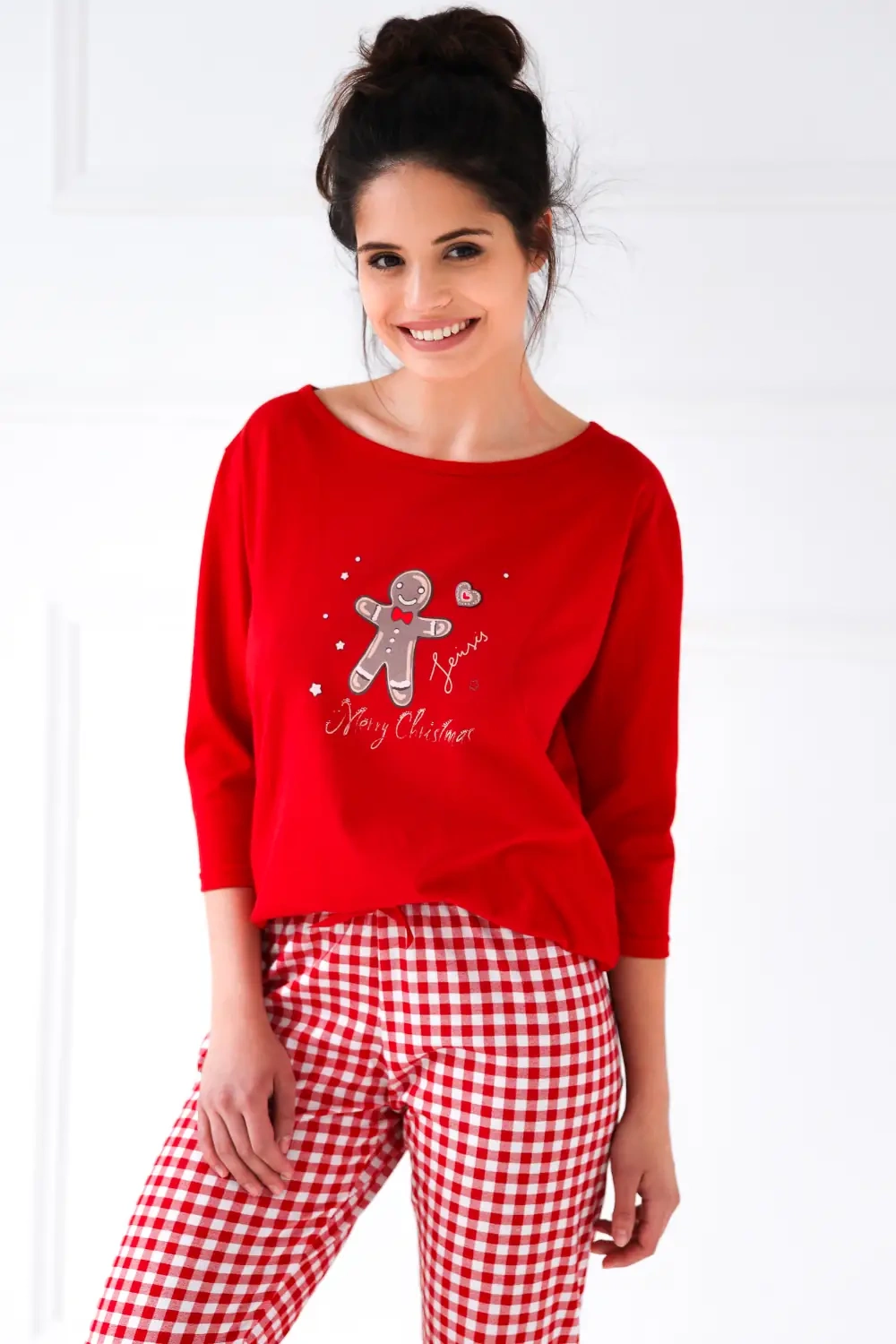 Śliczna, miła piżama damska uszyta ze 100% bawełny. Góra to bluzka z rękawem 3/4 oraz okrągłym dekoltem. Na piersi świąteczny nadruk z ciasteczkiem. W komplecie długie, proste spodnie w kratę. W pasie wygodna gumka oraz satynowa kokardka.