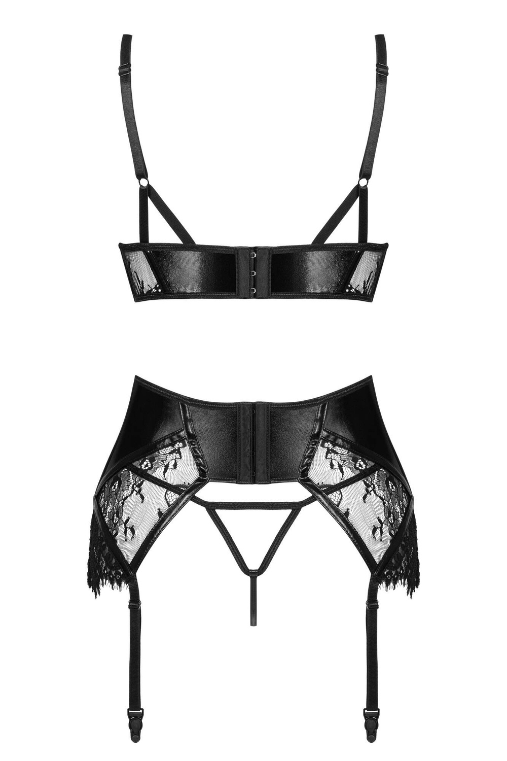 Piękny, erotyczny komplet z serii Leonela w kolorze czarnym. Połączenie delikatnej koronki z materiałem wetlook wzbudzi żądzę w niejednym mężczyźnie.