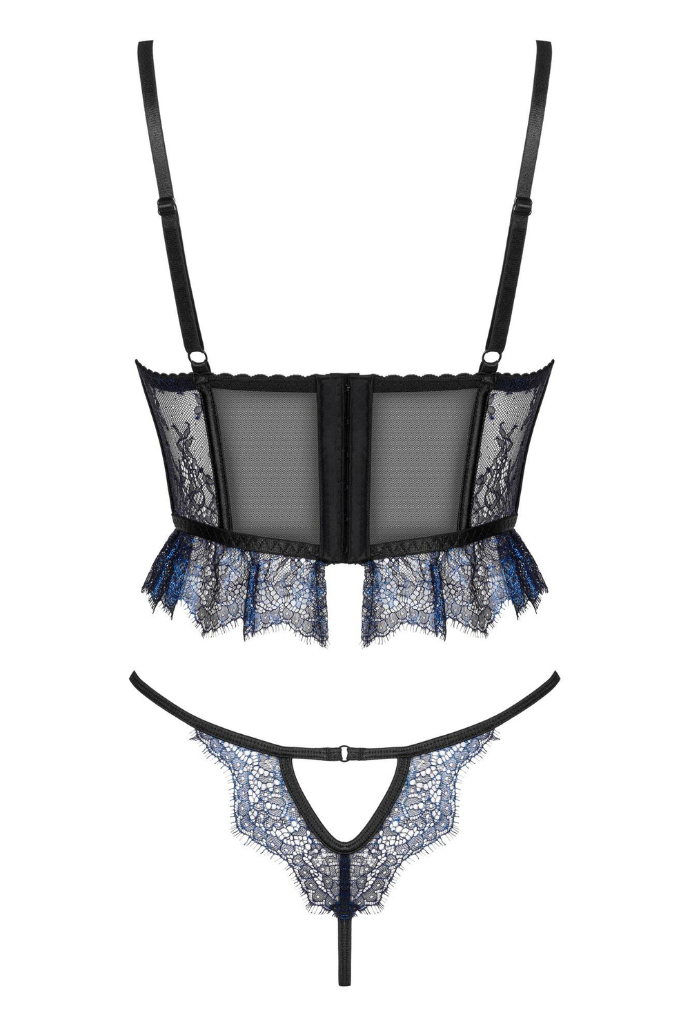 Ekskluzywny, romantyczny komplecik bielizny na który składa się krótki gorset oraz stringi. Komplet został wykonany z czarnego tiulu oraz koronki w metalicznym, szafirowym odcieniu.