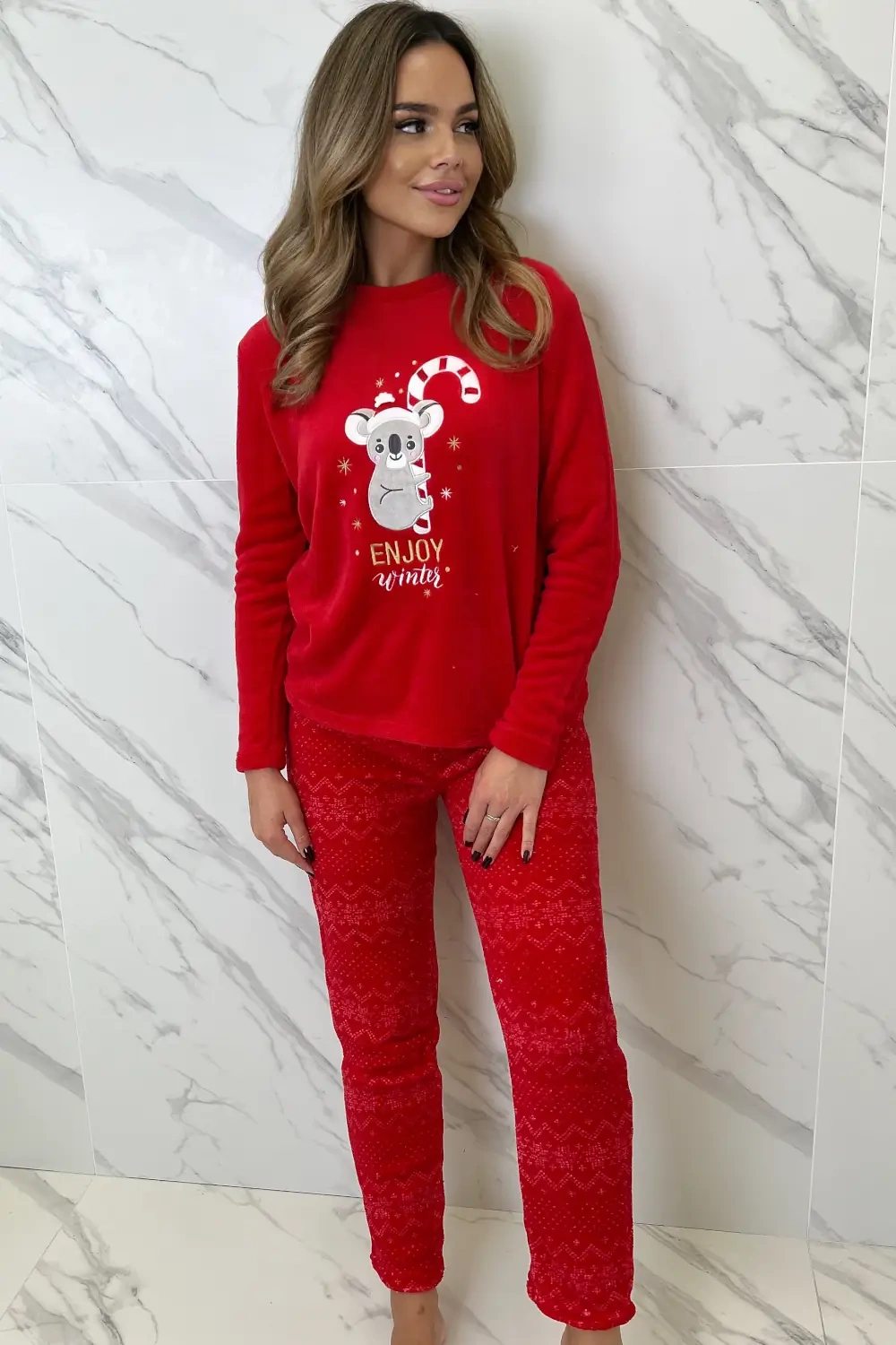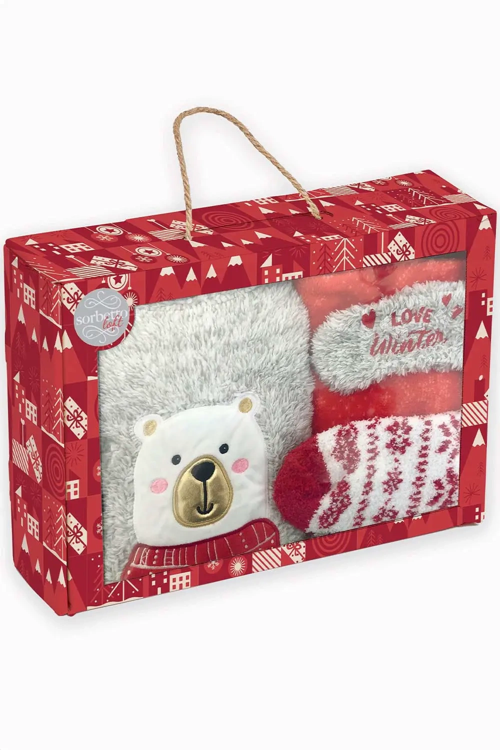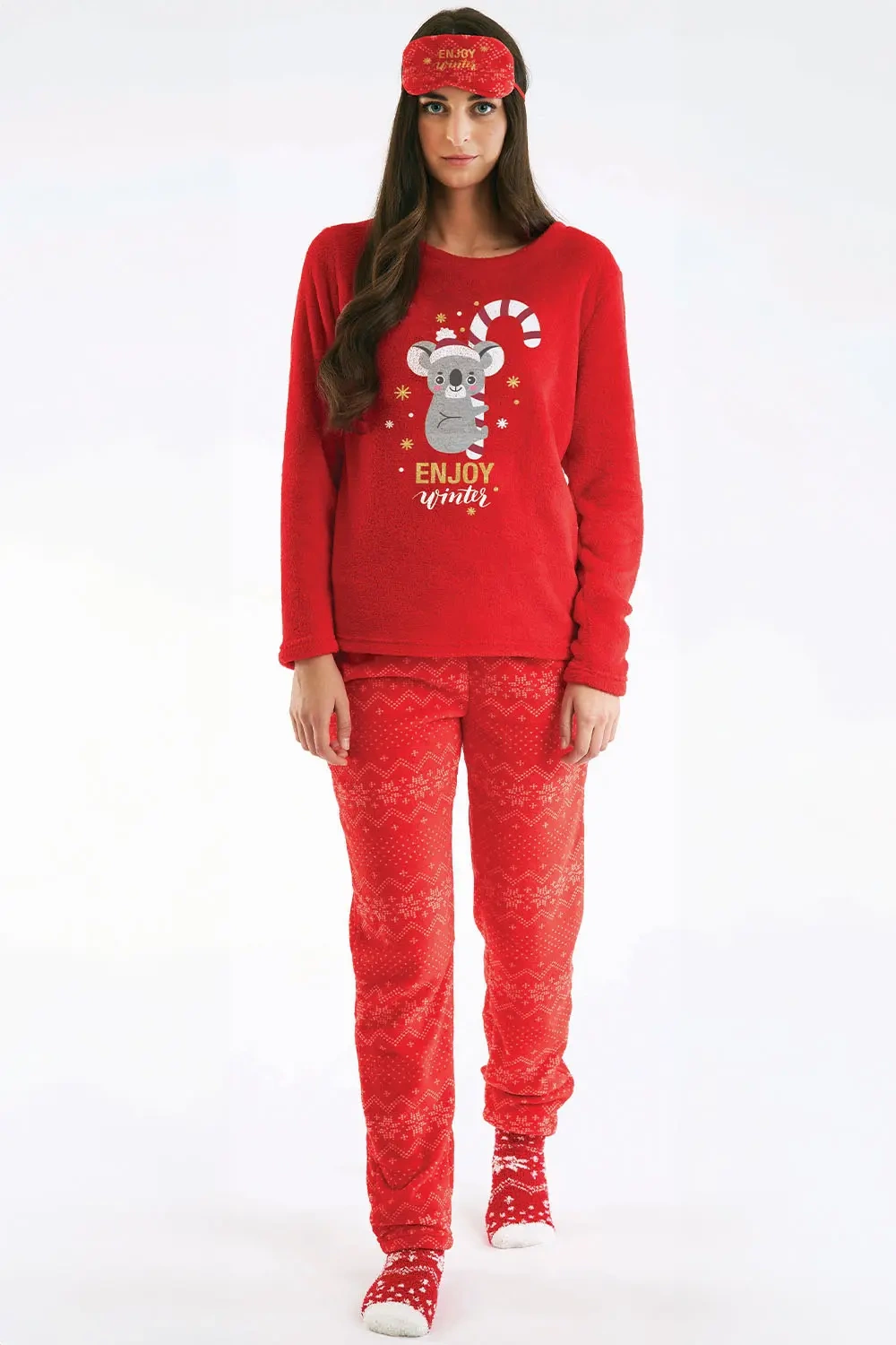 Niepowtarzalny zestaw prezentowy w eleganckim pudełku. Składa się z polarowej piżamy, ciepłych skarpet oraz opaski na oczy. Ciepła piżama w miękkiej, polarowej dzianiny z okrągłym dekoltem i słodką aplikacją z misiem koala. Uroku dodaje haft ze złotymi gwiazdkami. Spodnie z wygodną gumką w pasie, miękkie i komfortowe, ozdobione gwiazdkami. W komplecie czerwono-białe, ciepłe skarpety oraz czerwona opaska na oczy z haftem.