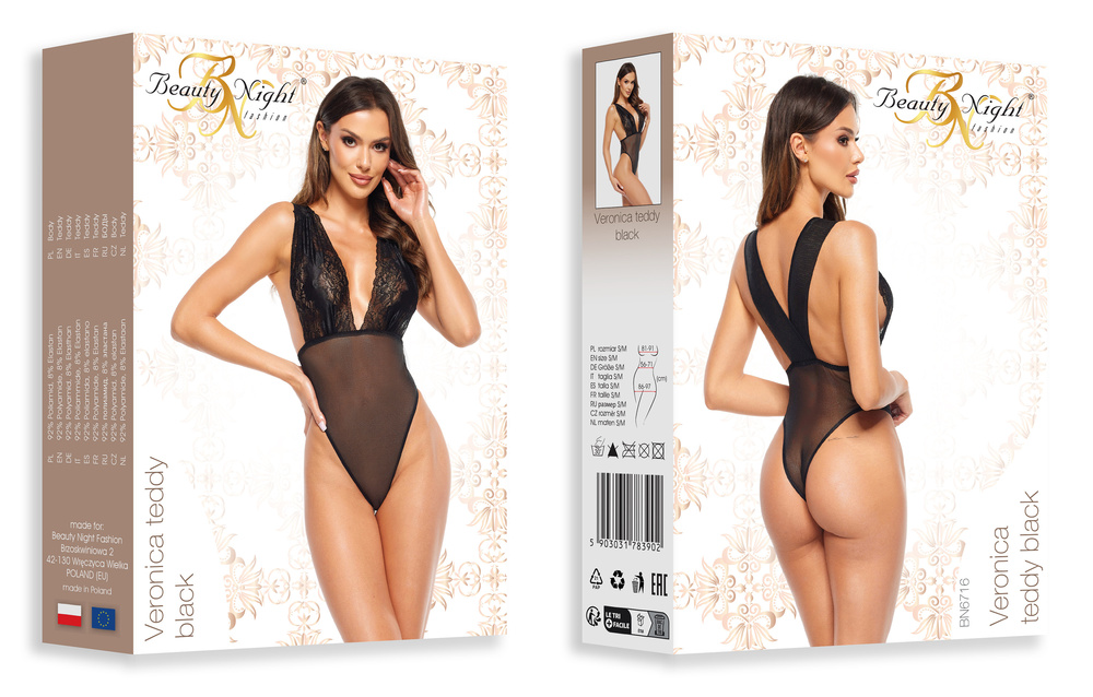 Piękne, klasyczne body w odcieniu głębokiej czerni wykonane z koronki oraz mieniącego się, błyszczącego tiulu. Głęboki dekolt oraz grube, krzyżujące się na plecach ramiączka dodają wyrafinowania.