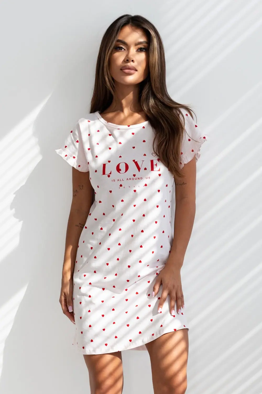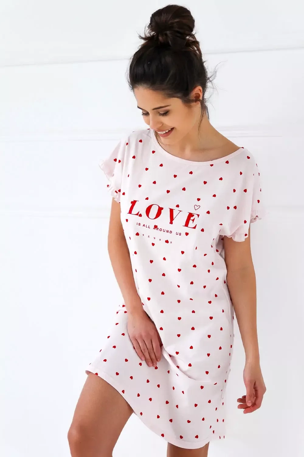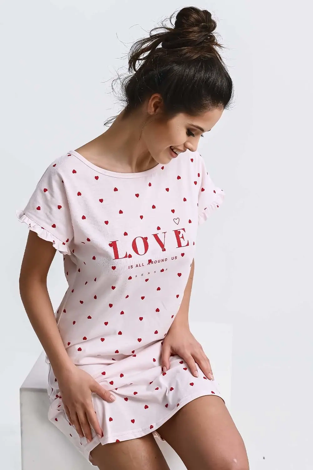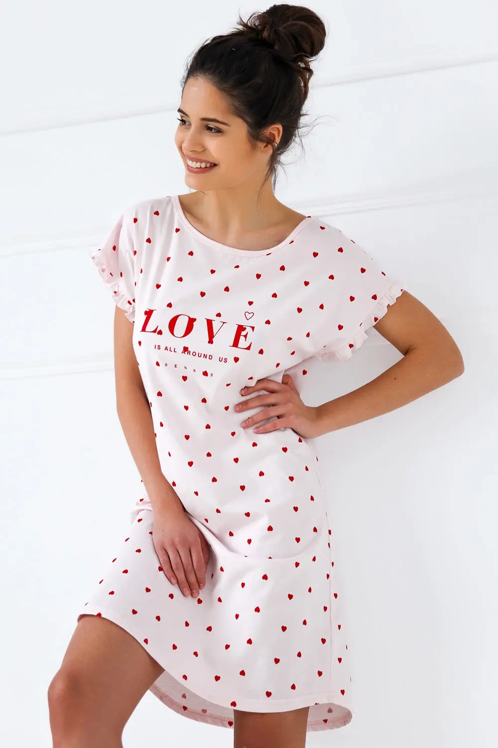 Koszula z Bawełny LOVE IS ALL w serca, różowa Piękna koszula nocna ze 100% bawełny. Dekolt okrągły. Przód zdobiony napisem " Love Is All ". Koszula w różowym kolorze zdobiona drobnymi serduszkami. Długość przed kolano. Idealny pomysł na prezent.