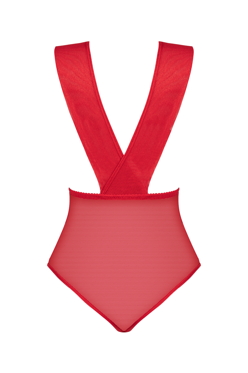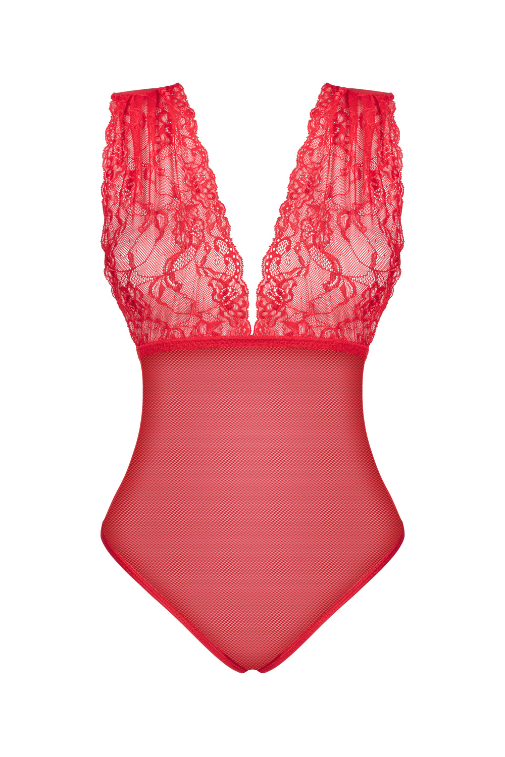 Piękne, klasyczne body w odcieniu ognistej czerwieni wykonane z koronki oraz mieniącego się, błyszczącego tiulu. Głęboki dekolt oraz grube, krzyżujące się na plecach ramiączka dodają wyrafinowania.