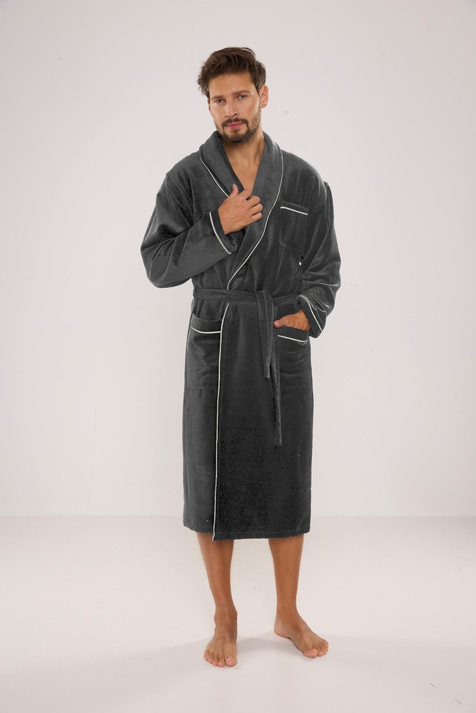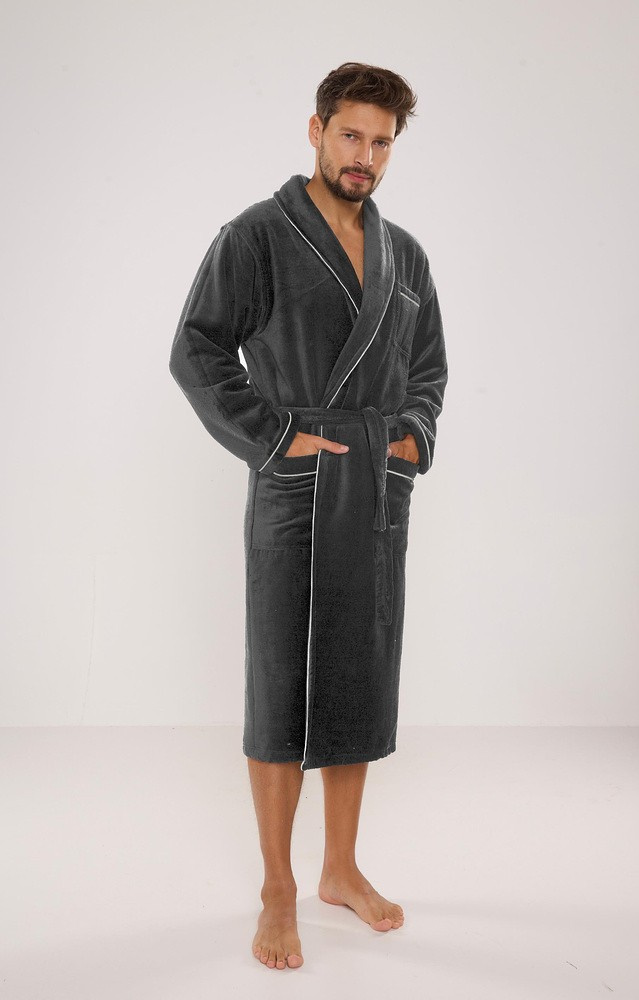 Długi szlafrok męski- z szalowym kołnierzem- wiązany w pasie- z naszytymi kieszeniami po bokach i jedną na wysokości klatki piersiowej- materiał przyjemny w dotyku, typu frotte- idealnie wchłania wodęSkład: 50% bawełna, 50% poliamid