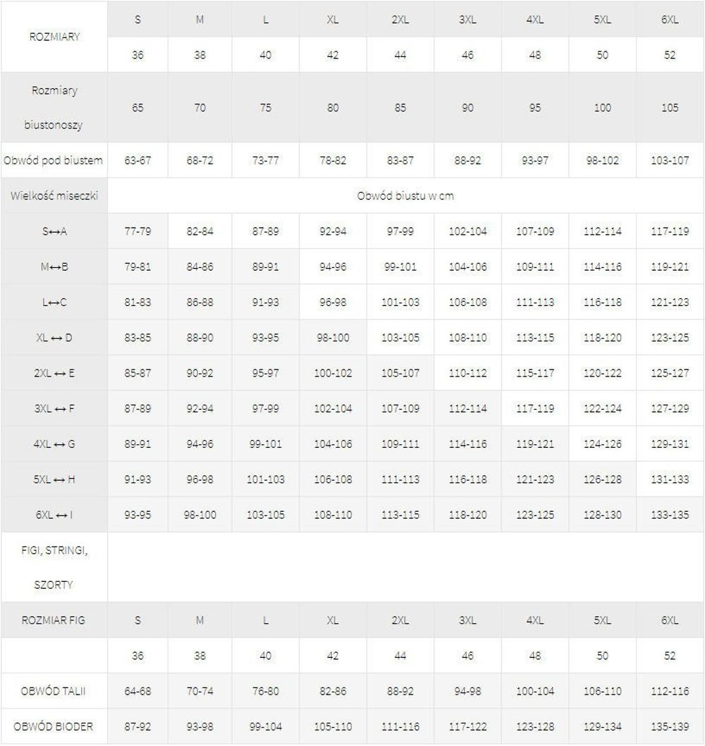 Rozmiar | Obwód w biuście (cm) | Obwód pod biustem (cm) | Obwód bioder (cm) |