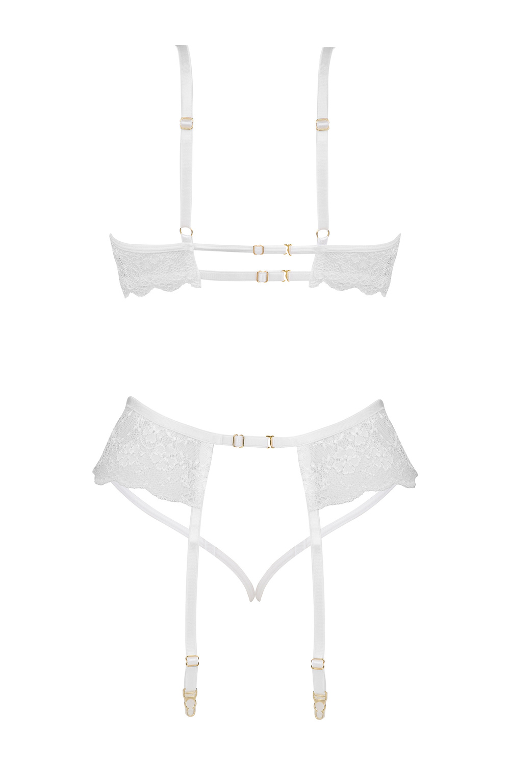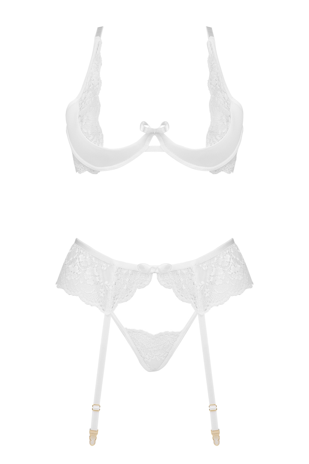 Klasyczny komplet bielizny w kolorze białym, składający się z biustonosza, stringów oraz pasa do pończoch. Biustonosz podsiada lekkie usztywnienie w miseczkach oraz regulację w ramiączkach jak i z tyłu.