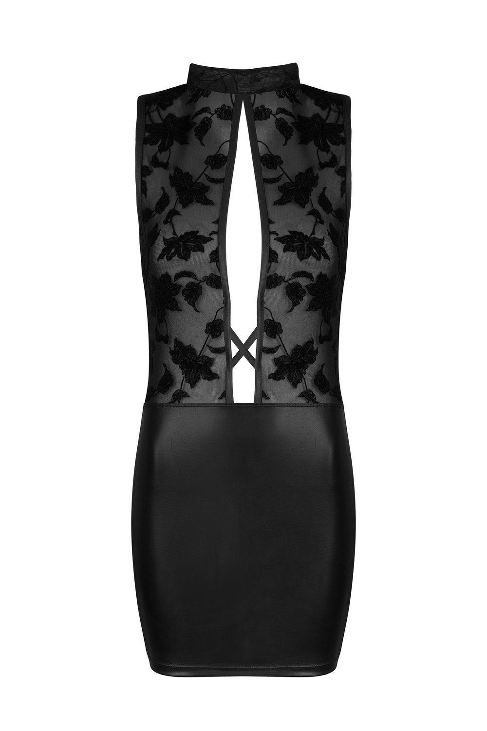 Głęboki dekolt zarówno z przodu jak i z tyłu dodaje powabu. Dolna część to mini wykonana z ekoskóry. Sukienka posiada zapięcie na rzep na karku.