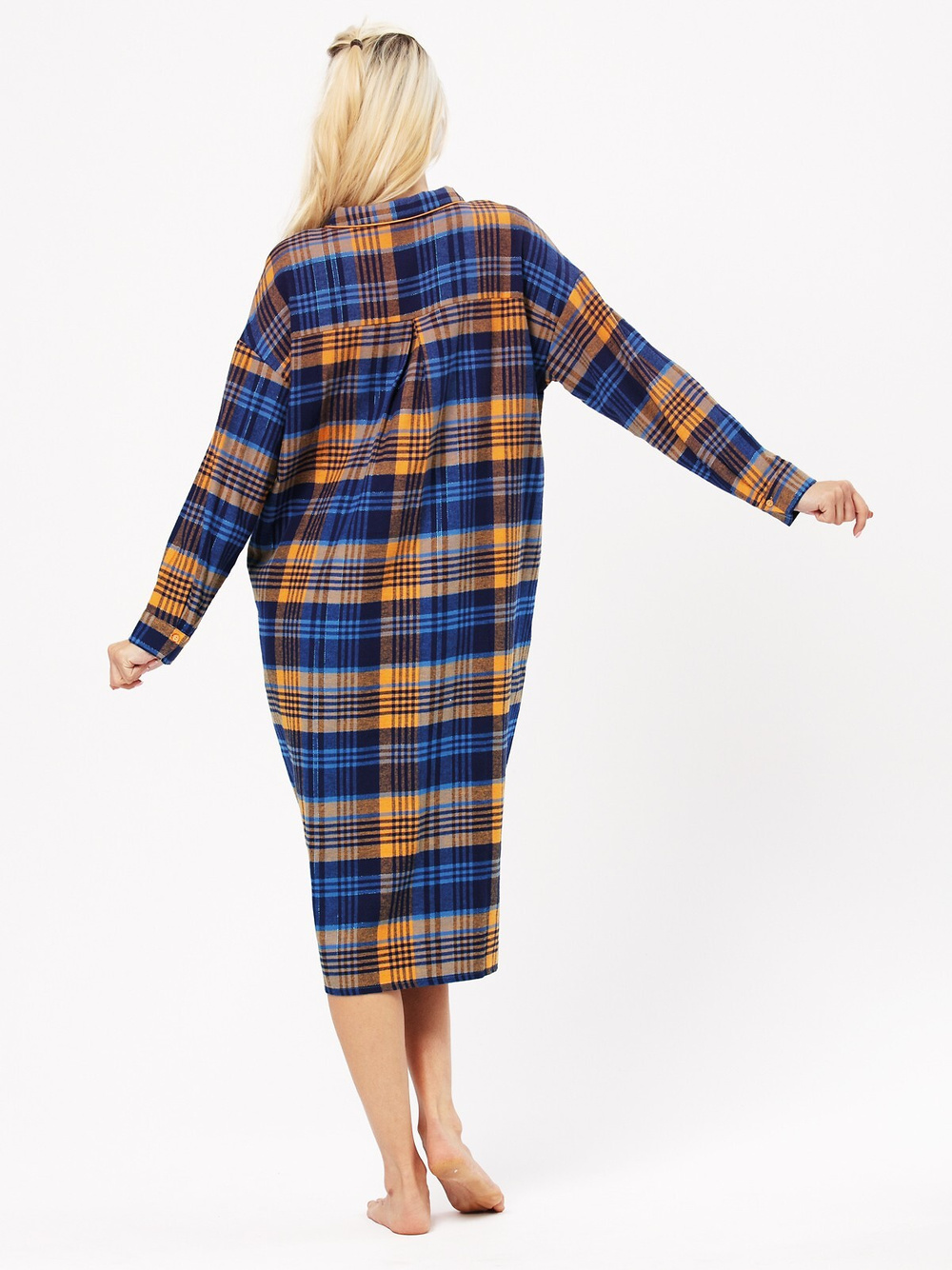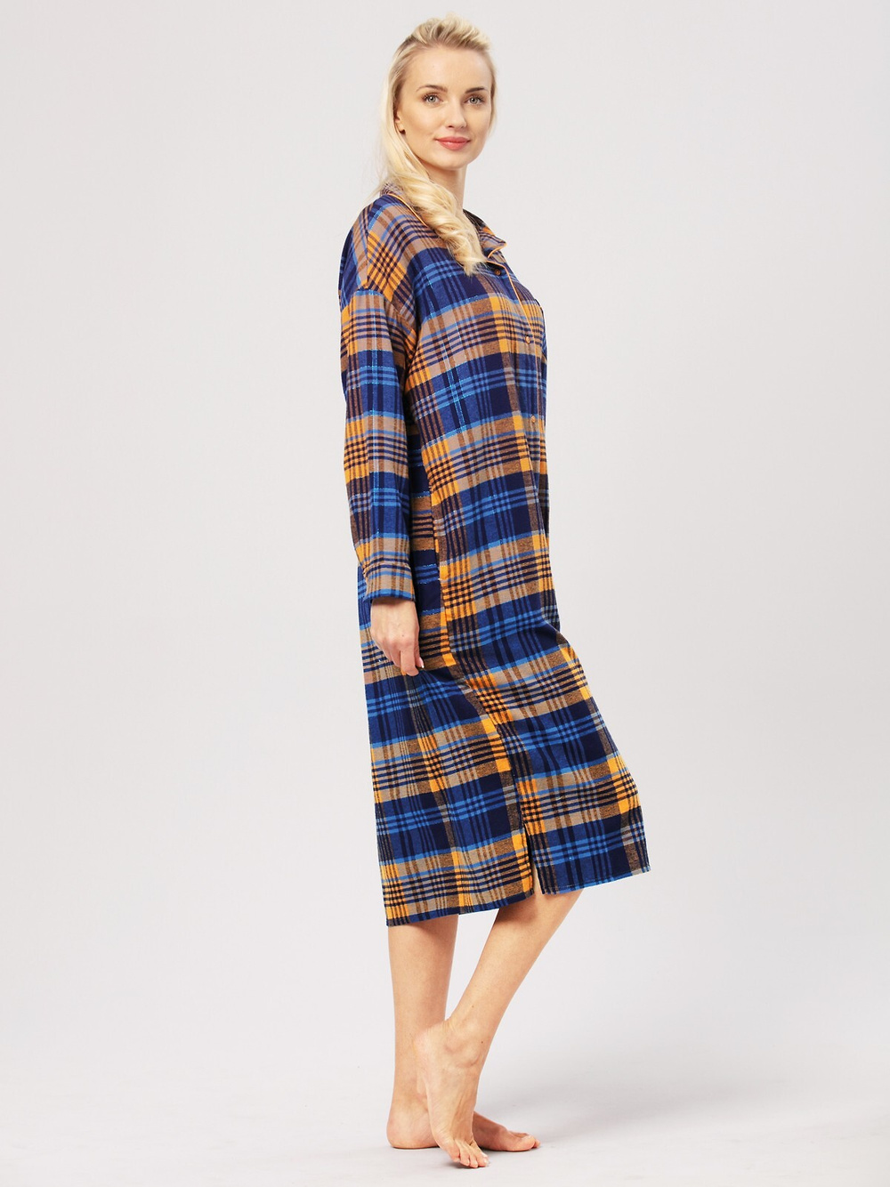 Długa koszula damska - wykonana z wysokiej jakości flaneli - wzór w kratkę - zapinana na guziki - z kołnierzykiem - długi, obniżony rękaw - w linii talii wygodne kieszenie - tył z kontrafałdą zapewnia wygodę użytkowania - długość za kolano   Skład: 100% bawełna