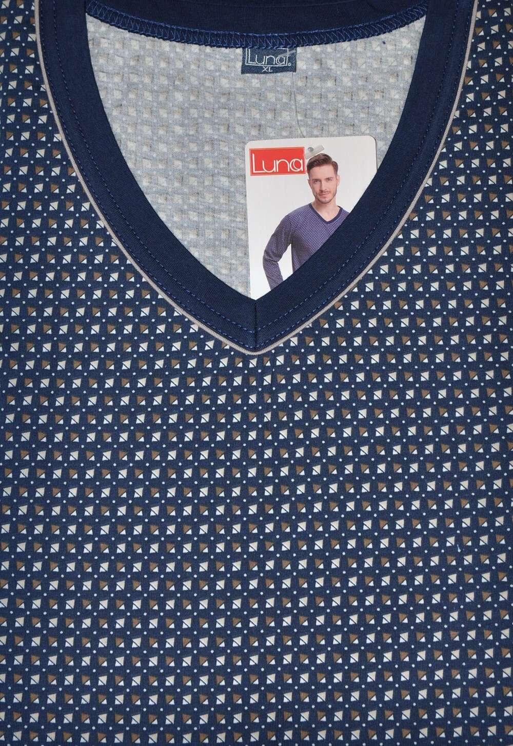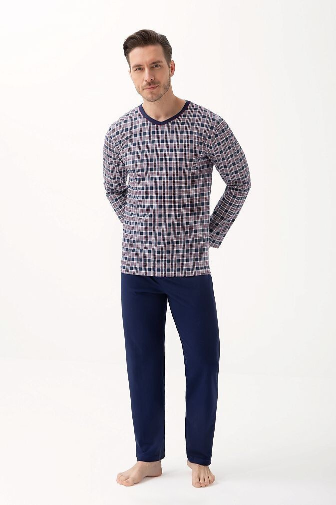 Piżama męska - z wysokiej jakości bawełny - wzorzysta bluza z długim rękawem - dekolt w serek - spodnie długie, jednolite nawiązujące kolorystycznie do całości piżamy - powyższe kolory i wzory są przykładowe i mogą ulegać zmianom Skład: 100% bawełna