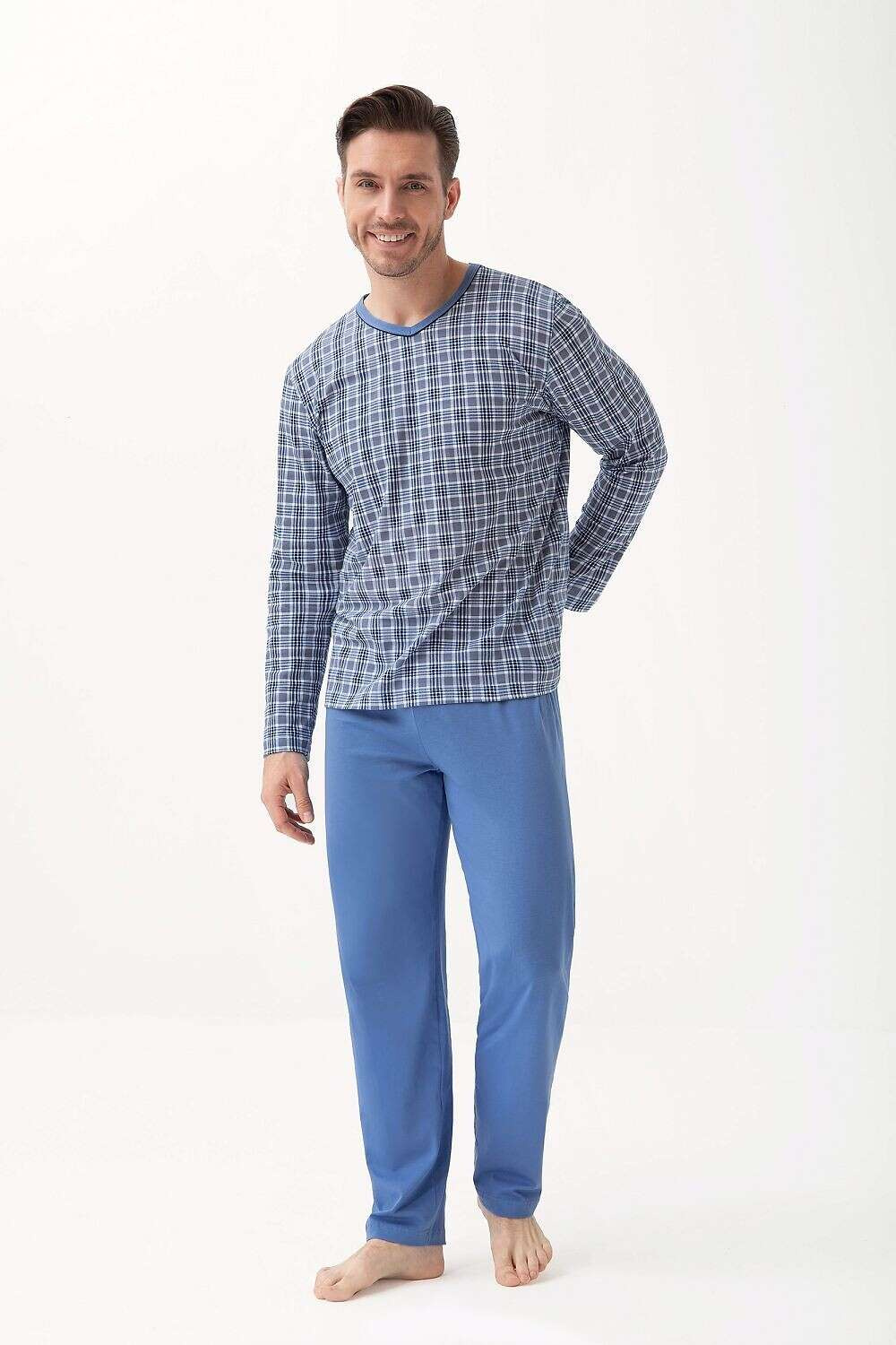 Piżama męska - z wysokiej jakości bawełny - wzorzysta bluza z długim rękawem - dekolt w serek - spodnie długie, jednolite nawiązujące kolorystycznie do całości piżamy - powyższe kolory i wzory są przykładowe i mogą ulegać zmianom Skład: 100% bawełna