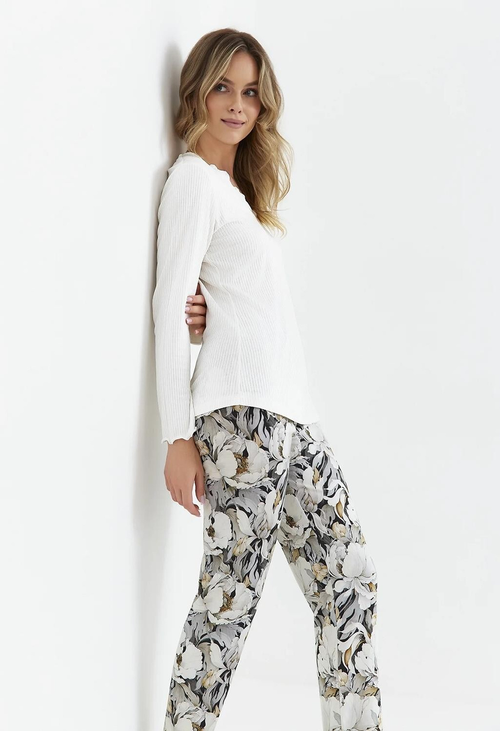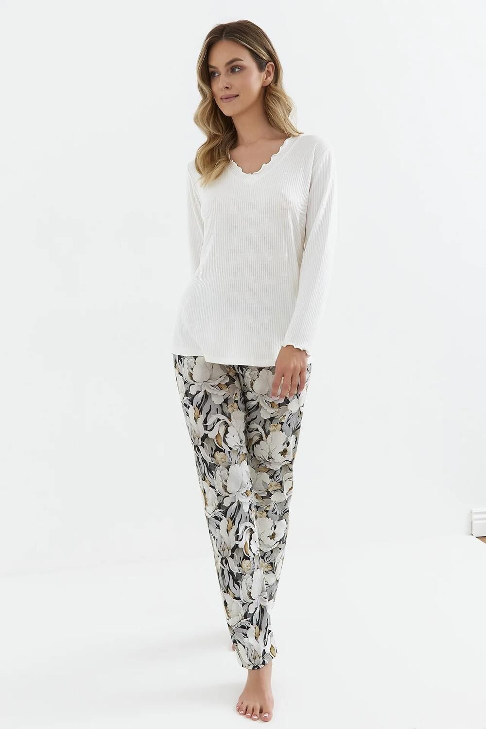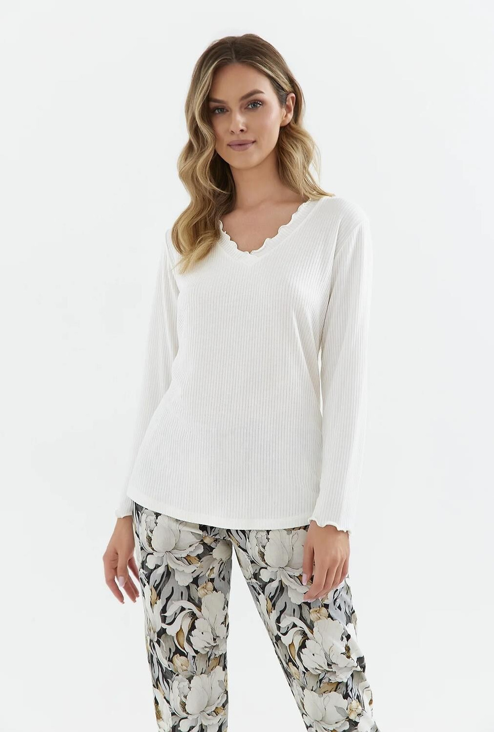 Piżama damska- z wiskozy i bawełny wysokiej jakości,- koszulka z prążkowanej dzianiny- z długim rękawem- dekolt w serek- dekolt i rękaw wykończone falbanką (mereżką)- długie spodnie o prostym kroju, zdobione printem w kwiatySkład: koszulka - 95% wiskoza, 5% elastan, spodnie - 100% bawełna