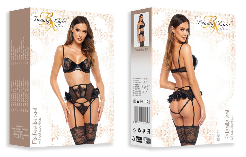Ten zjawiskowy komplet bielizny łączy elegancję z odważnym, zmysłowym stylem. Wykonany z czarnej koronki, tiulu i materiału typu wetlook, idealnie podkreśla kobiece kształty, dodając pewności siebie. Biustonosz z fiszbinami oraz koronkowymi miseczkami doskonale eksponuje biust, zapewniając jednocześnie komfort noszenia. Wysoki pas do pończoch z delikatnymi falbankami podkreśla talię, a regulowane paski umożliwiają idealne dopasowanie. Całość dopełniają zmysłowe stringi, które harmonijnie komponują się z resztą zestawu.