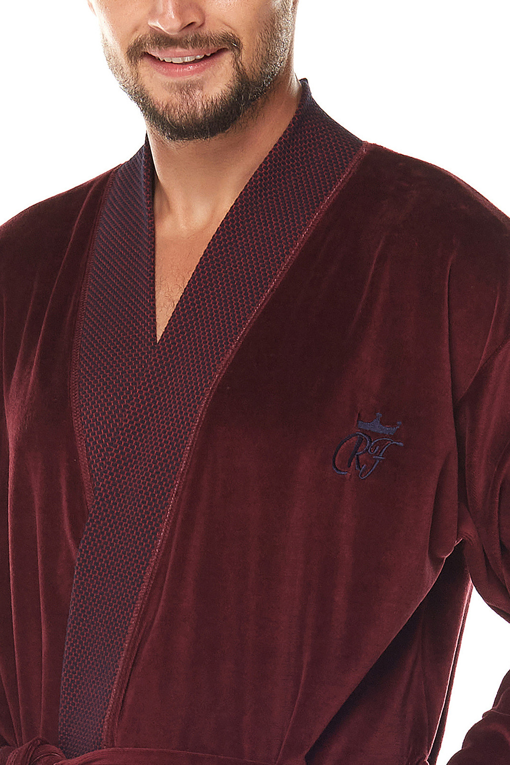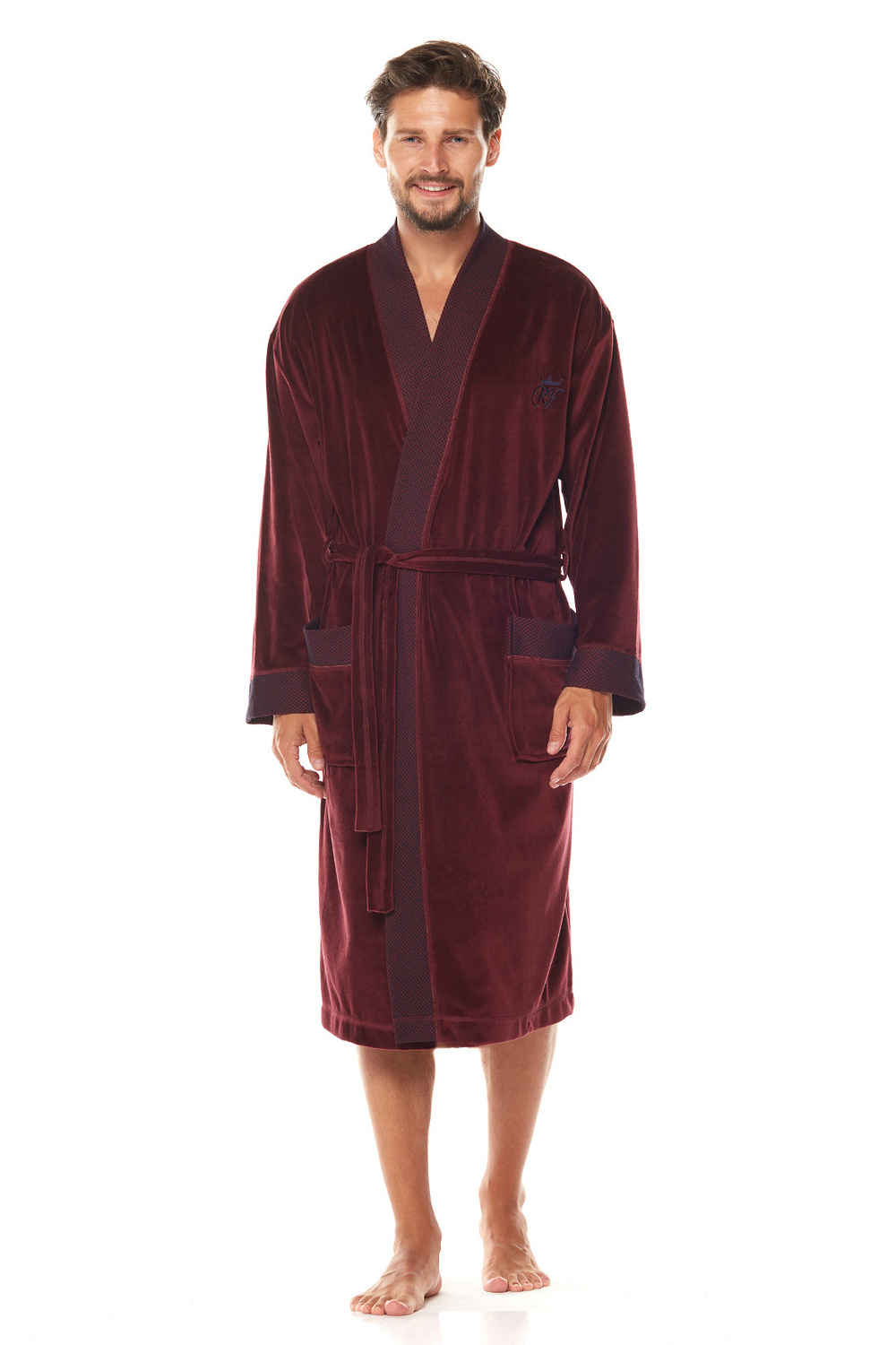- długi, z szalowym kołnierzem, wiązany w pasie