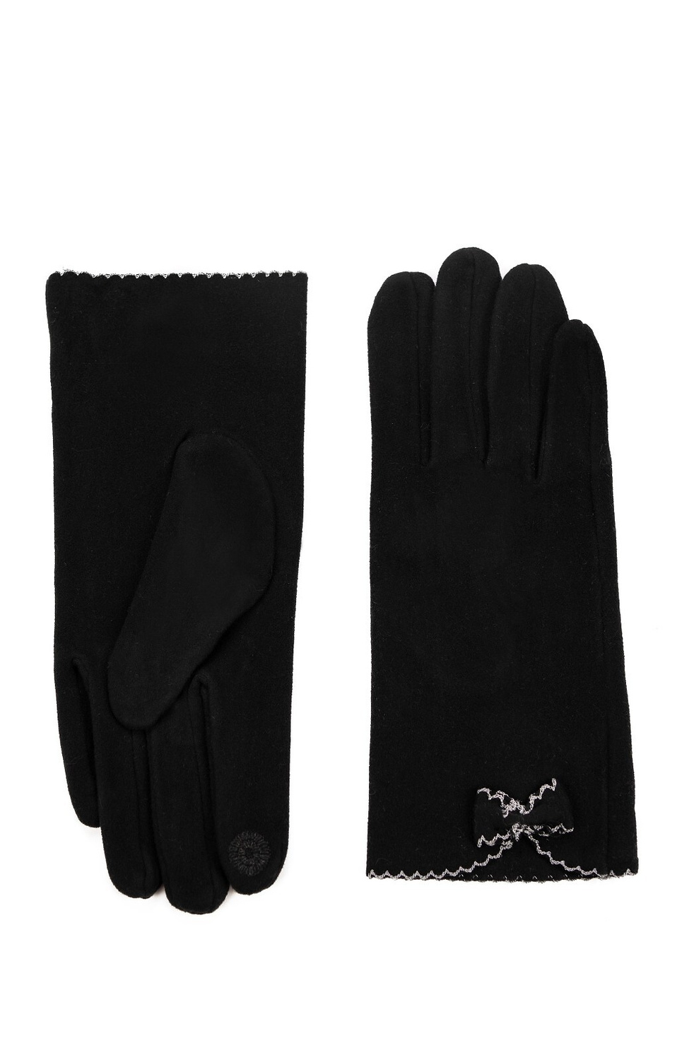 Damskie rękawiczki - wykonane z bardzo przyjemnego, miękkiego i rozciągliwego materiału - z ozdobnym wykończeniem i kokardką - kompatybilne z ekranami dotykowymi - umożliwiają łatwe korzystanie ze smartfona bez potrzeby zdejmowania ich z dłoni - uniwersalny dodatek do eleganckich jesienno-zimowych płaszczy czy casualowych stylizacji   Skład: 100% poliester