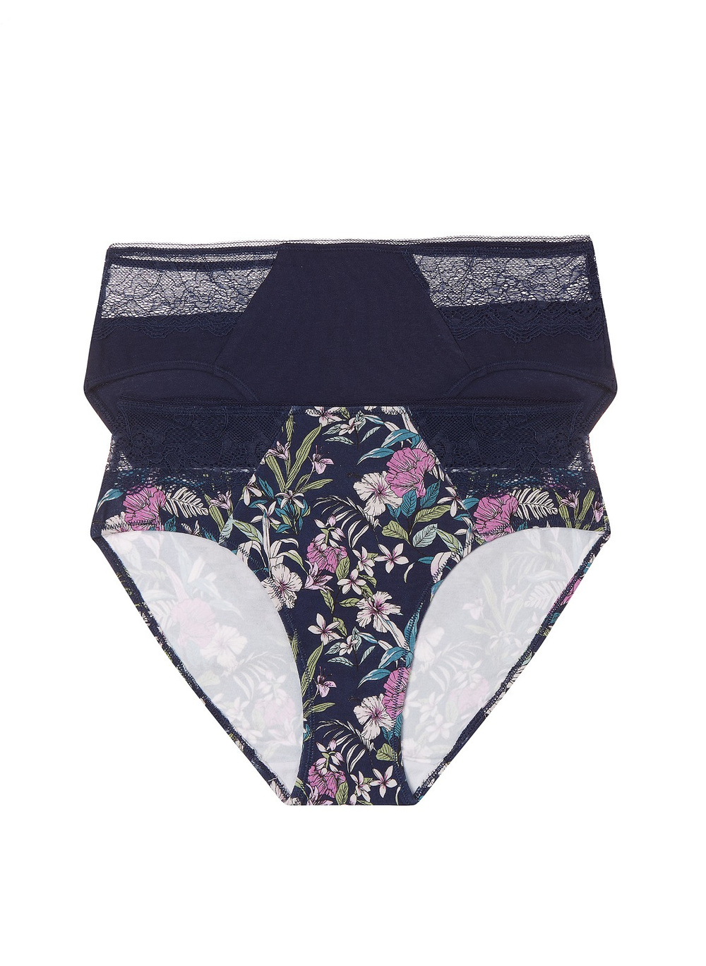 Figi damskie z wysokiej jakości, wzorzystej i gładkiej bawełny - pas zdobi efektowna koronka - pakowane w foliowy woreczek po dwie sztuki Skład: 95% bawełna, 5% elastan