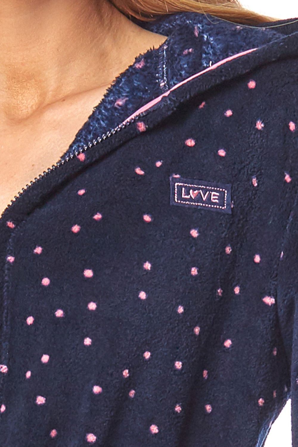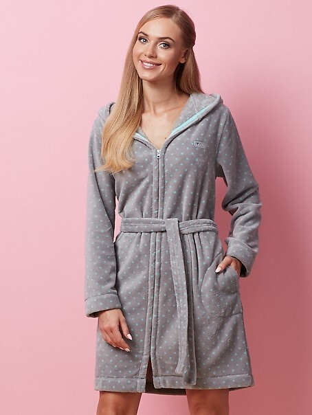 Wygodny szlafrok damski - z miękkiej dzianiny w kropki - z kapturem - zapinany na zamek - na wysokości klatki piersiowej delikatna aplikacja - wiązany w pasie - po bokach kieszenie Skład: 100% poliester